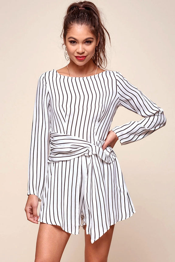 A high neck is a tasteful addition to this adorable pinstripe long-sleeved romper. Pair with high stilettos and a bold lipstick.
