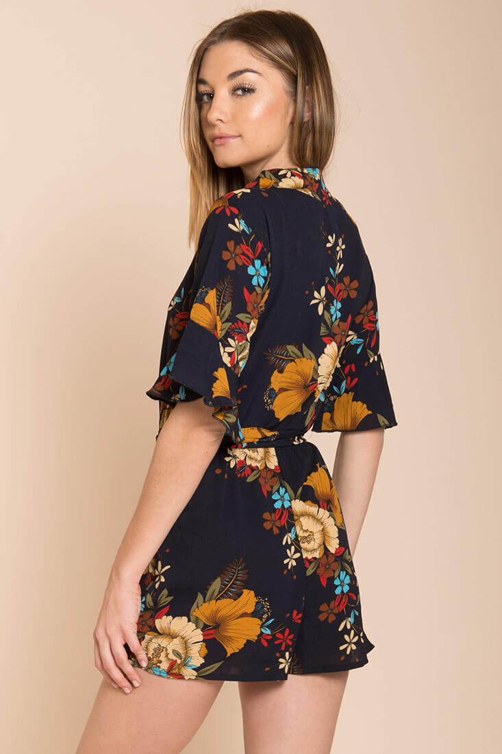 What could be better than a boho kimono? The Jade Floral Boho Romper gives a wrap illusion and delicately colored floral design. Pair with slip on sandals to stay casual and cool.