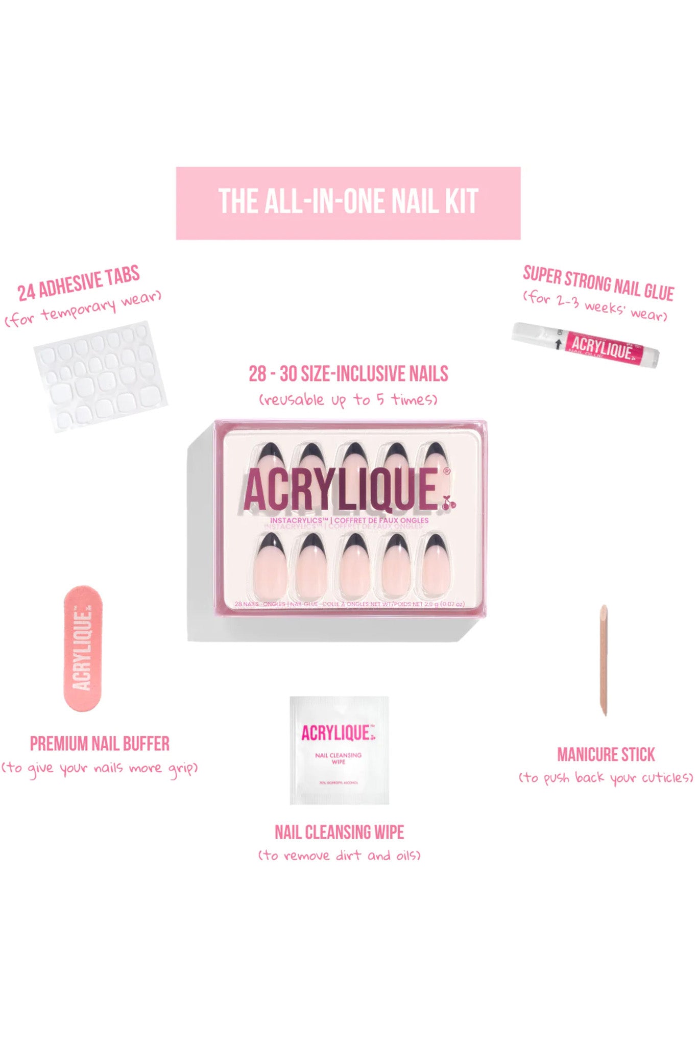 Say hello to Instacrylics™ by ACRYLIQUE. Designed to add a pop of color and personality to your look, they're perfect for a flirty date night or brunch with your besties! What are Instacrylics™? Instacrylics™ are acrylics that can be quickly and easily applied at home in under 10 minutes! You can wear them as is, or file and shape them to your desired preference. With a choice of two application methods, these acrylics can last for up to 2 weeks if applied with glue, or up to 5 days if applied with adhesive tabs, and can be reused if removed with care. Got last minute weekend plans? Haven’t had time to squeeze in a nail appointment? Or want to have a fresh set of nails but need to remove them for work? Instacrylics™ will have you looking fresh out of the nail salon ready in no time, so you can head straight to the bar for that cheeky drink! How to apply your Instacrylics™: Match acrylic nails using size guides underneath nail tips. Clip natural nails, buff surface and push cuticles back. Clean nails with alcohol pad and allow to dry. Apply a generous layer of glue or adhesive tab (depending on preferred method) onto clean nail. Align acrylic nail with cuticle and press down firmly for 20 seconds.