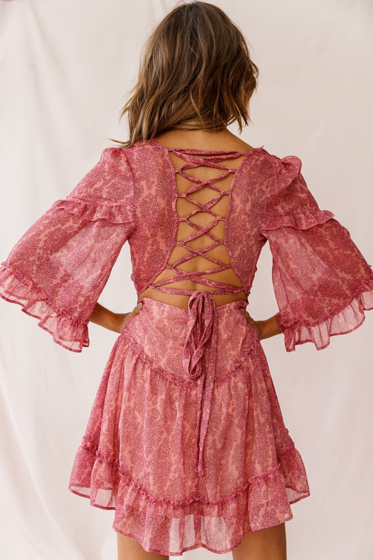 Turn heads wherever you go in this super cute dress featuring ruffle-fringed, billowy 3/4 bell sleeves, a tiered ruffle skirt and our favorite part, the lace-up back! We are loving the soft, floaty chiffon fabric. Perfect for your next event or lunch with your gal pals. Team it with single strap black heels or pointed-toe flats and a tote. Style queen!