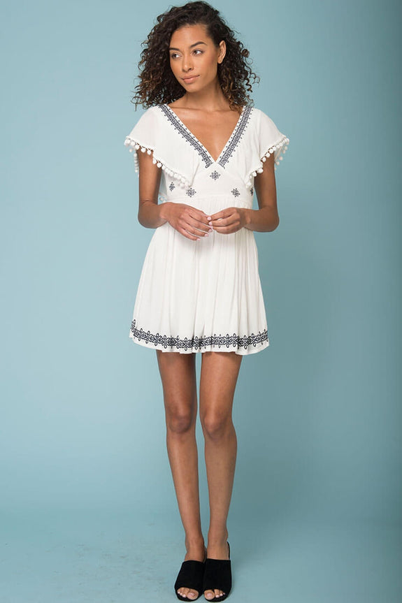 Embroidered neckline and hemline bring a delicate twist to this plunging neckline and pompom detail adorn the sleeves. Pair with comfy, luxurious sandals.