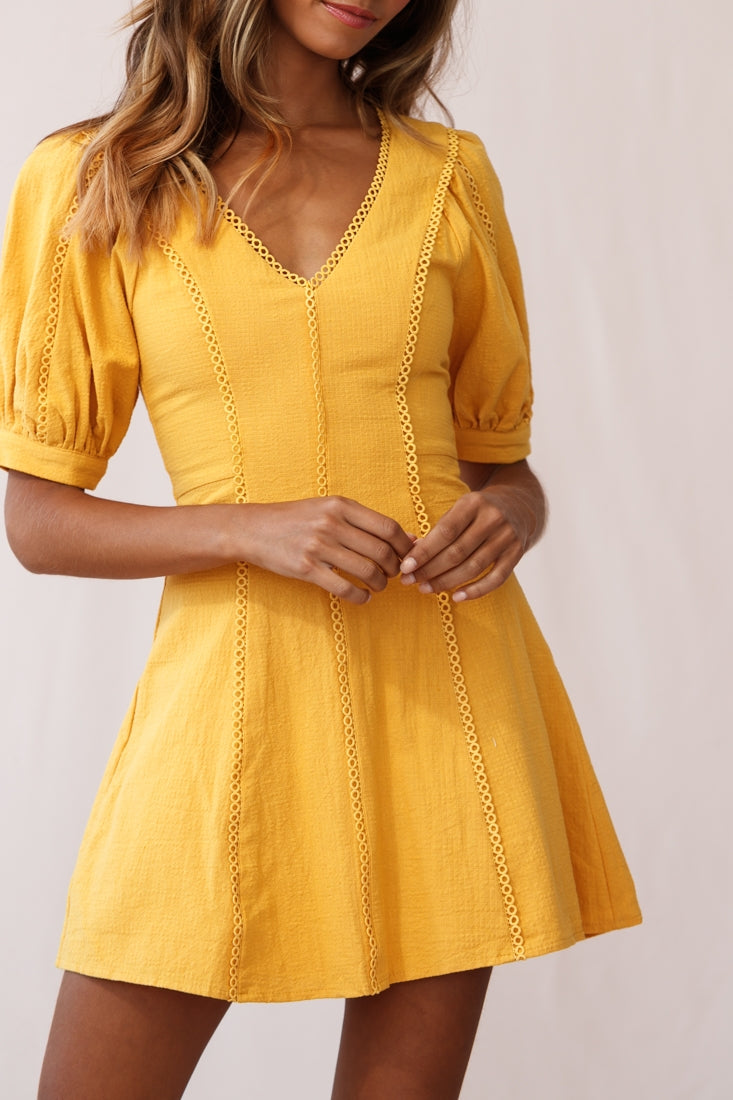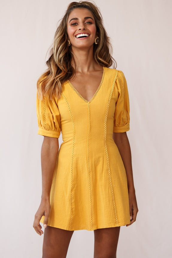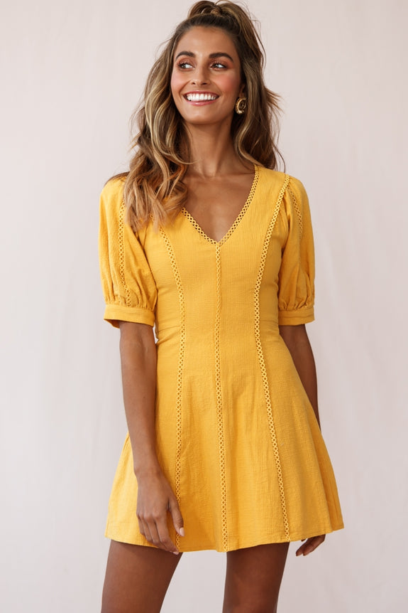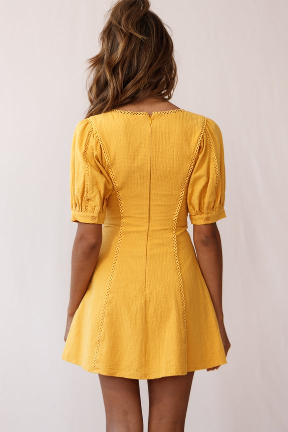 This A-Line Dress featuring on-trend puff sleeves and decorative embroidery trim running along the seams is the perfect choice for your summer wardrobe. Ideal for day to day activities or garden parties, wear it with high-top cons for a playful look or pair with single strap nude heels and a red lip to dress it up.