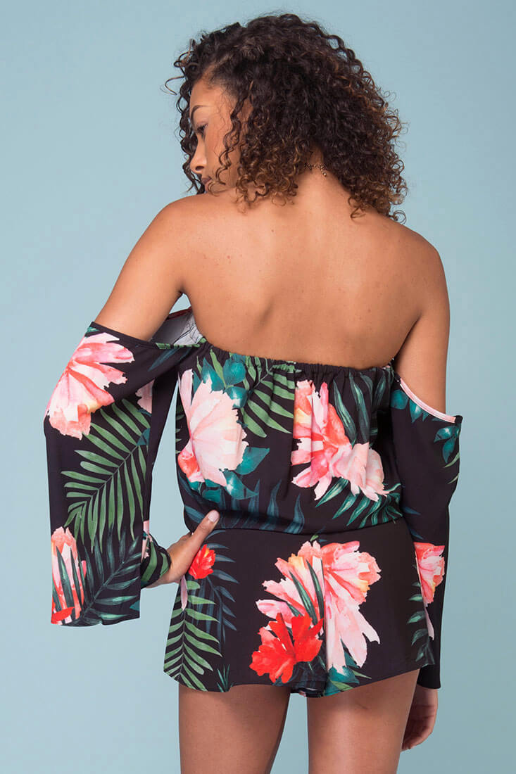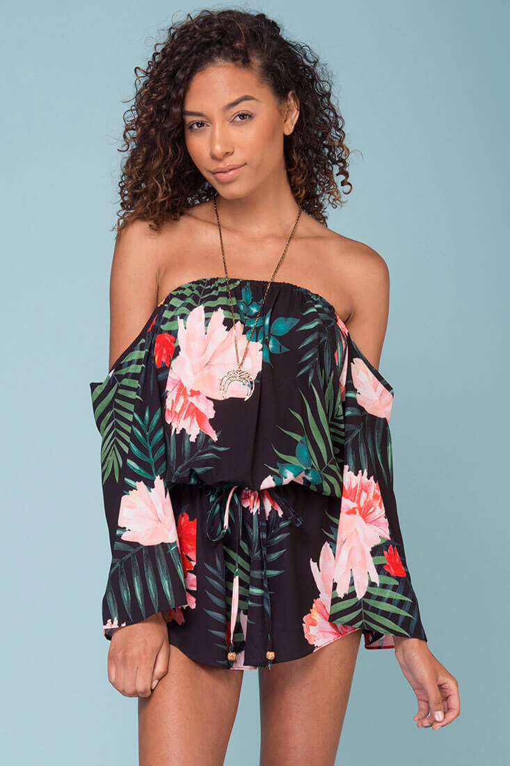 The world is your oyster in this tropical playsuit. Sport with a dewey tan and a floppy sunhat.