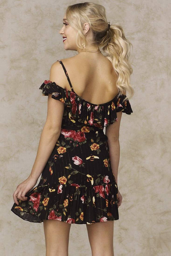 Heart shaped bodice and ruffles rhythmically dance around this classy skater dress. Pair with black flats and rosy cheeks and lips.