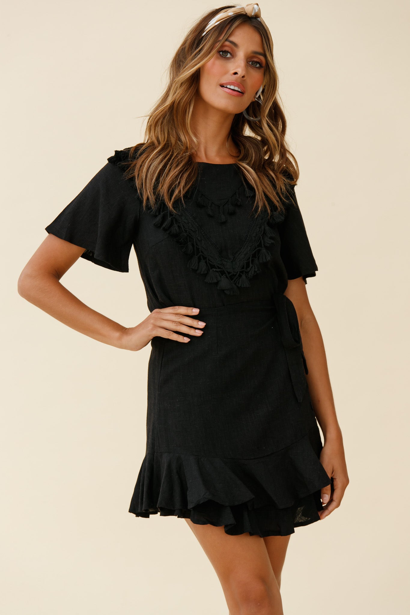 You'll go straight to the best-dressed list in our pretty Angelique dress. We are loving the pretty tassel trim feature in the bust and wrap style bottom. Perfect for looking ultra chic at the office or catching up with your besties at your fave lunch spot. Team it with mules and a tote for a look we are loving.