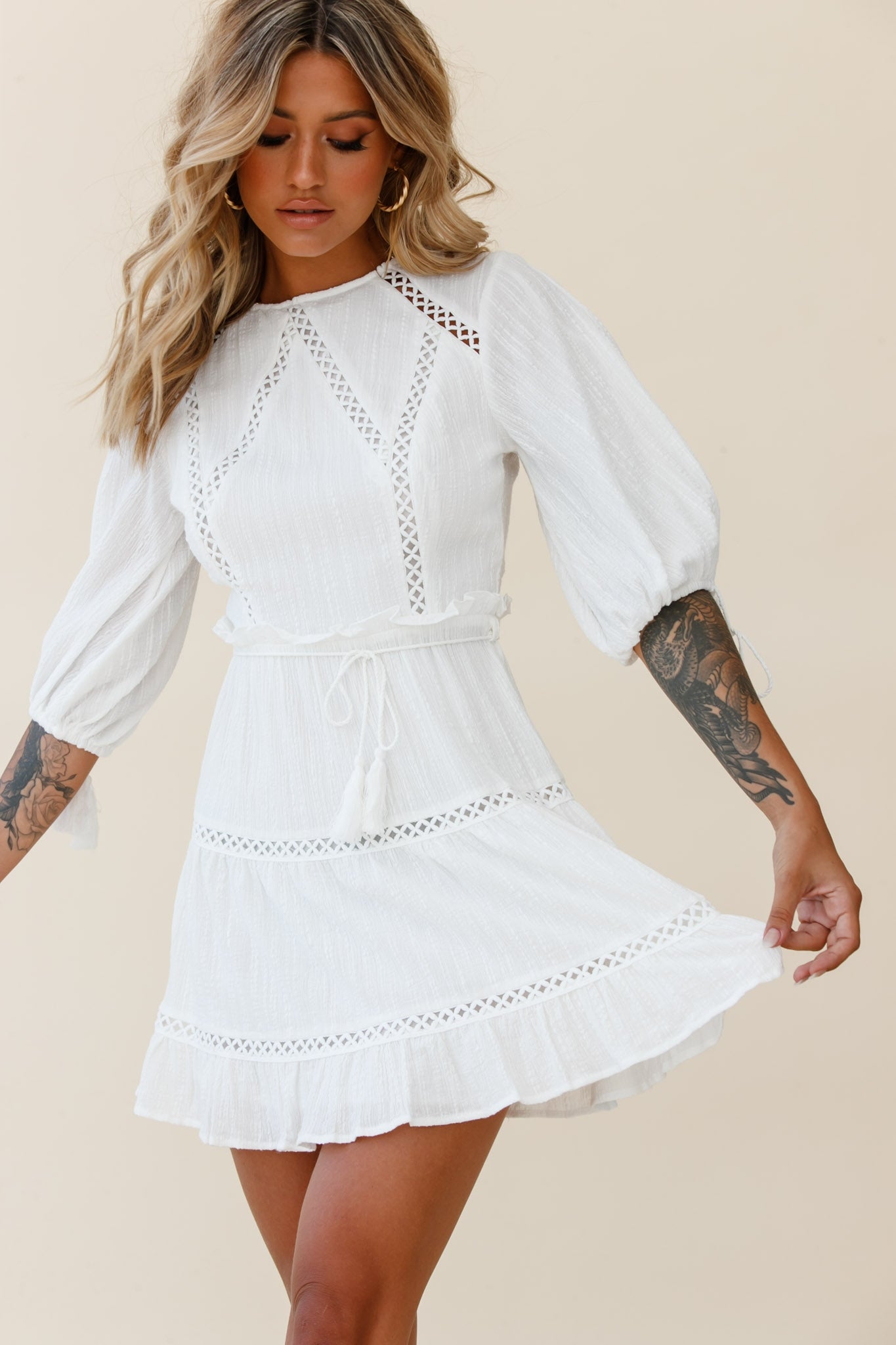 We are loving this super cute and unique dress. Partially lined, it features half puff sleeves with string-tie detail, crochet inserts, an exposed back and string tie around the waist. Wear it to a daytime event teamed with nude pumps and gold accent jewelry.