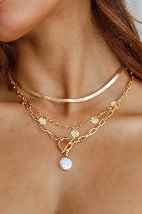 Our Marlo necklace set is just what you need to achieve the on-trend, layered necklace look. Featuring three different lengths and links and accented with a super cute, baroque, circular pearl pendant. Team it with some gold ear candy and you'll be turning heads.