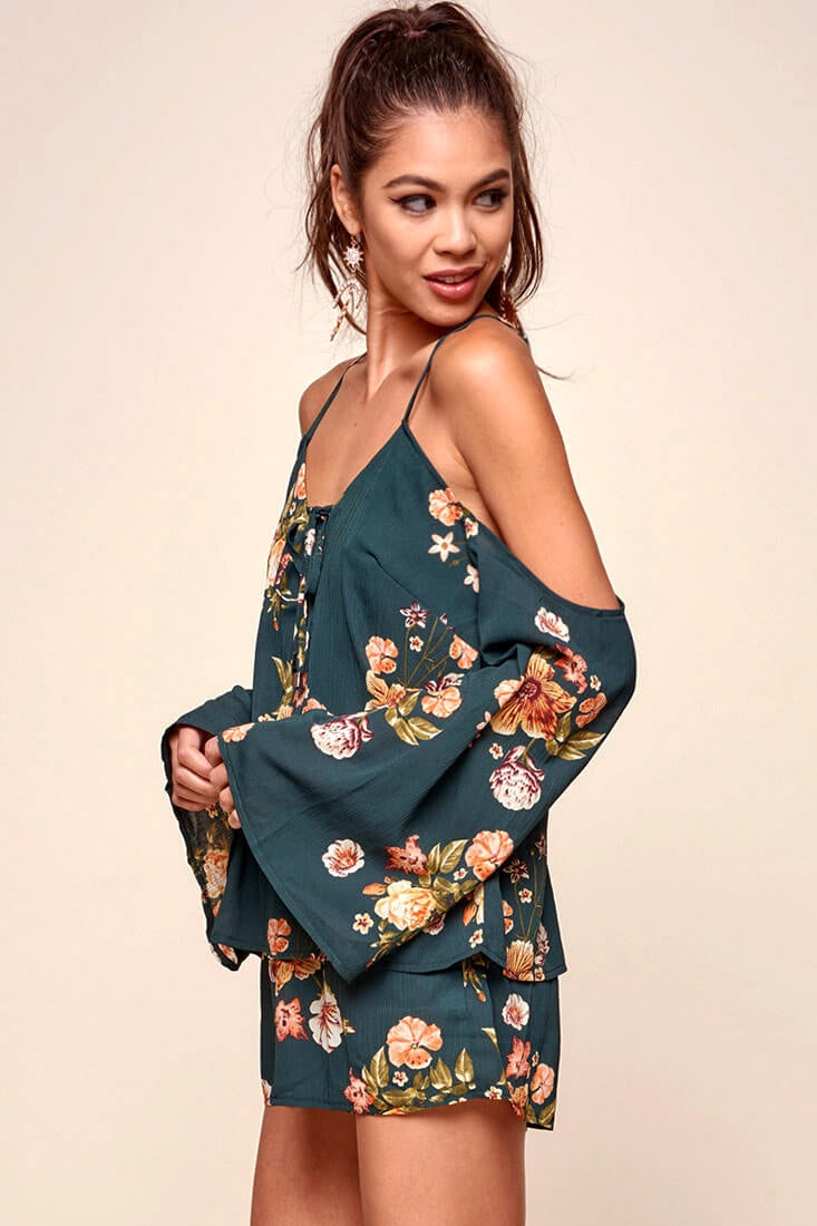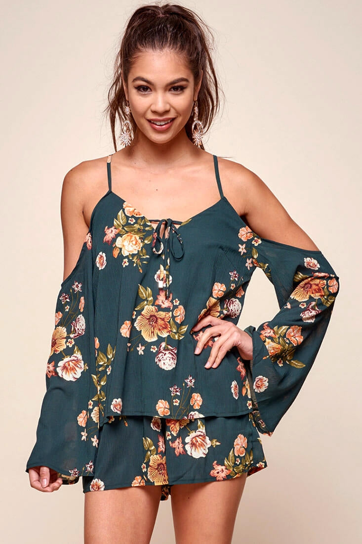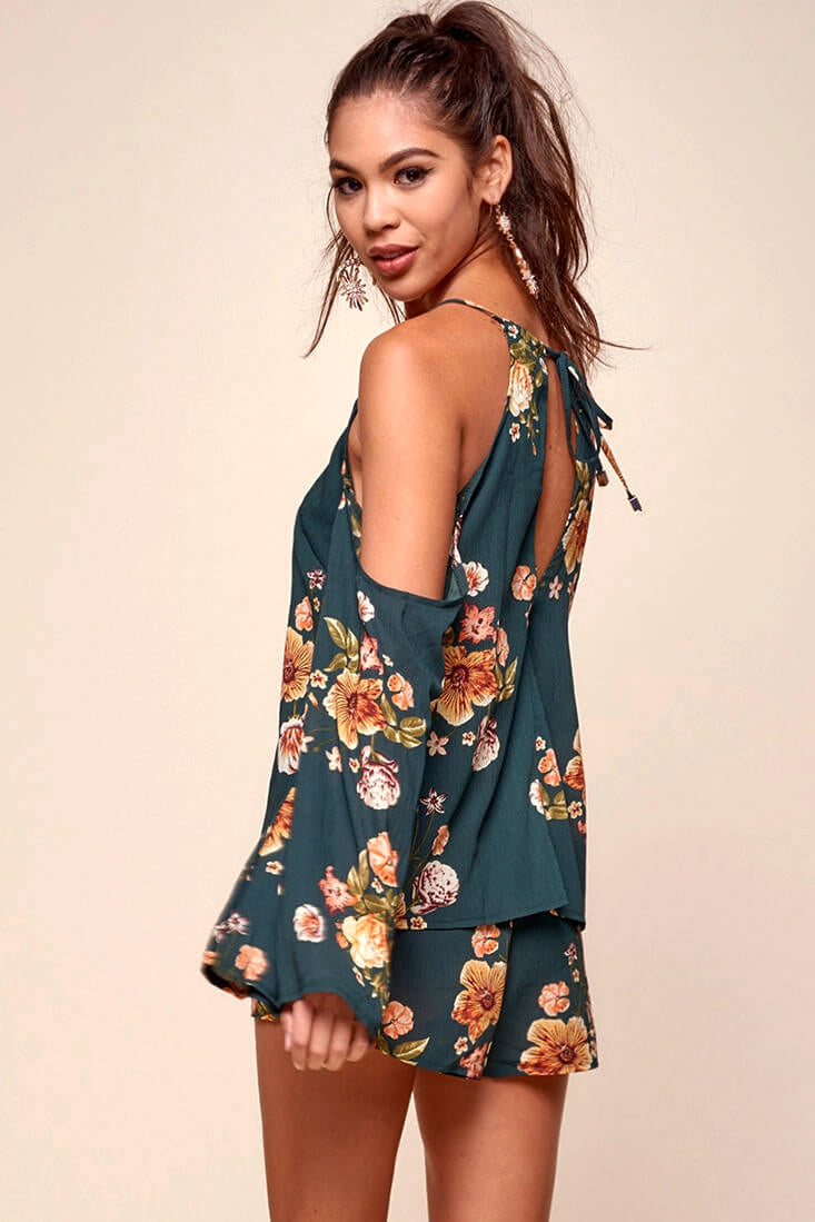 70's inspired bohemian romper with thin straps that flow elegantly into shoulder-less sleeves. Gorgeous bell sleeves keep things feminine. Pair with thin heels and dangly earrings.