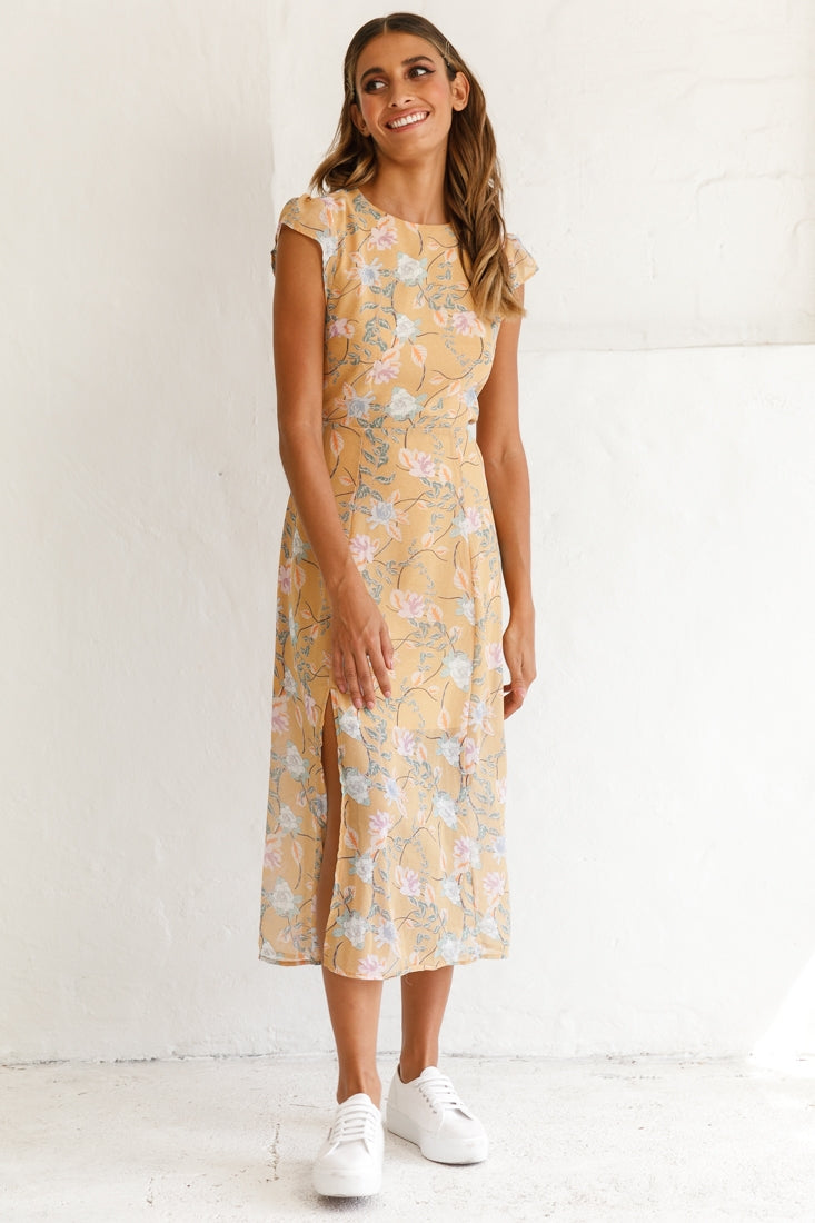 Becky Cap Sleeve Crew Neck Midi Dress Floral Print Mustard