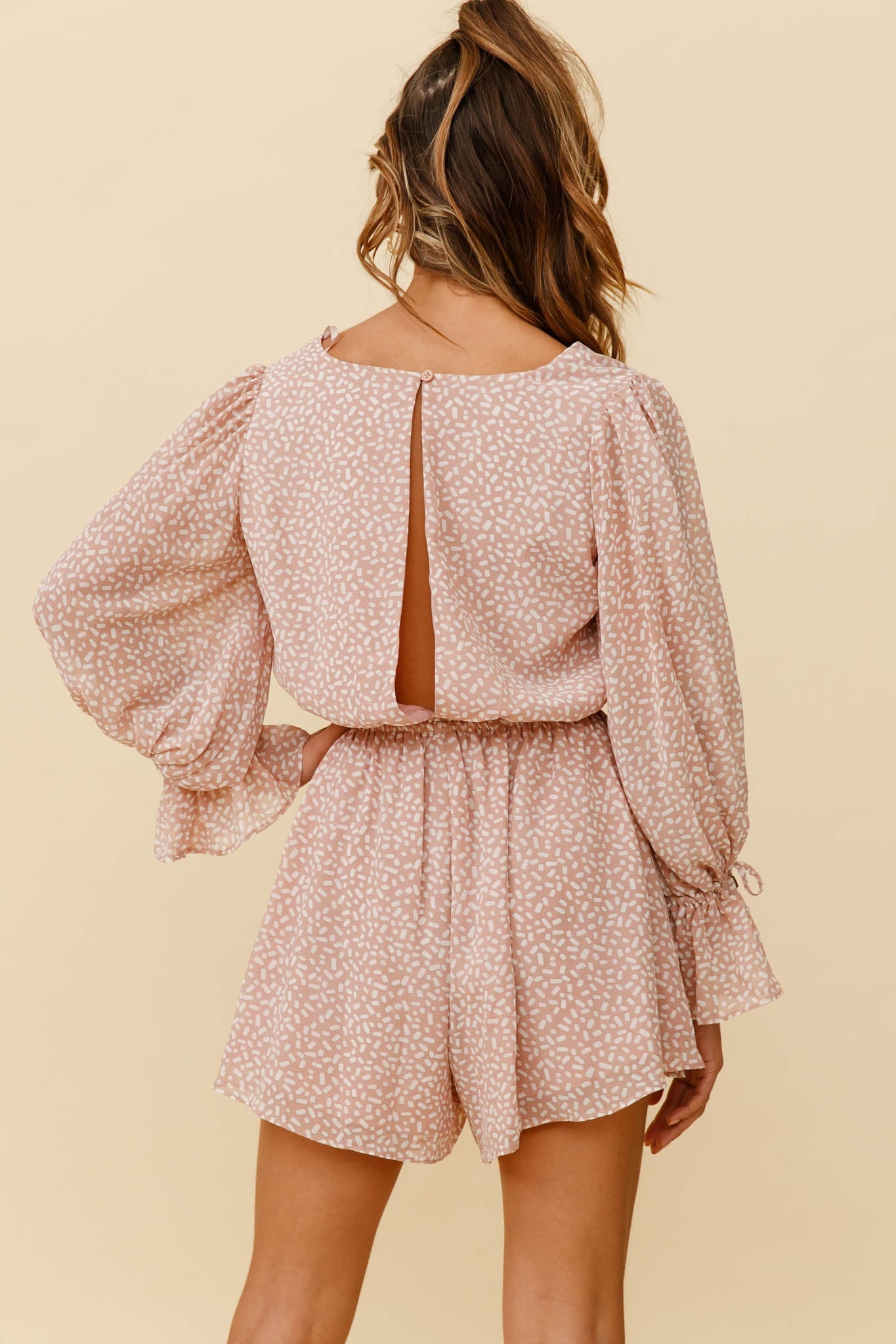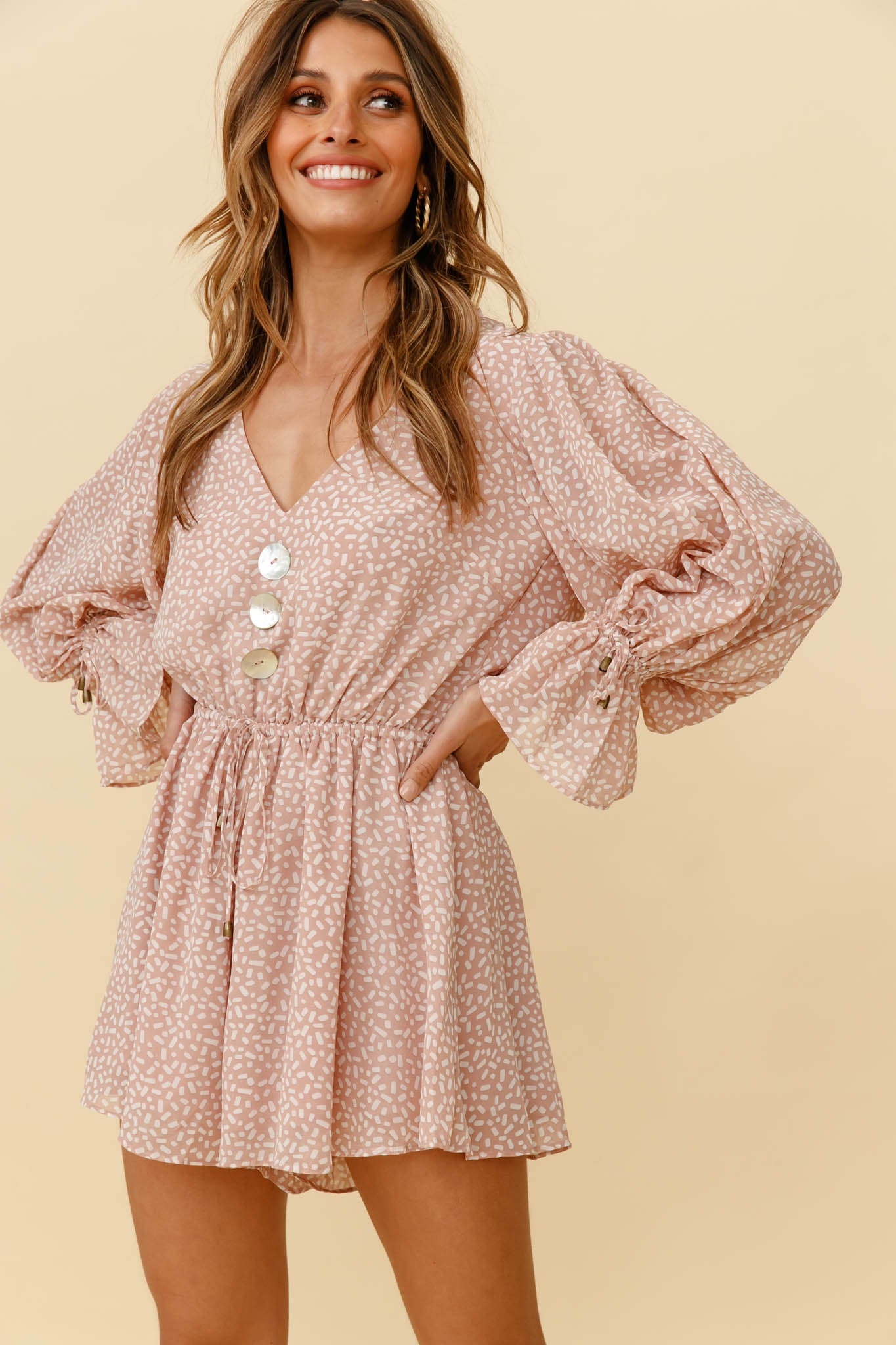 Hey there, cutie! You are causing quite the commotion in our adorable Believe It Or Not romper. We are all about the pearly, shell button detail in the bust and drawstring cuffs. Perfect for lunch with the girlies teamed with tan mules and a tote.