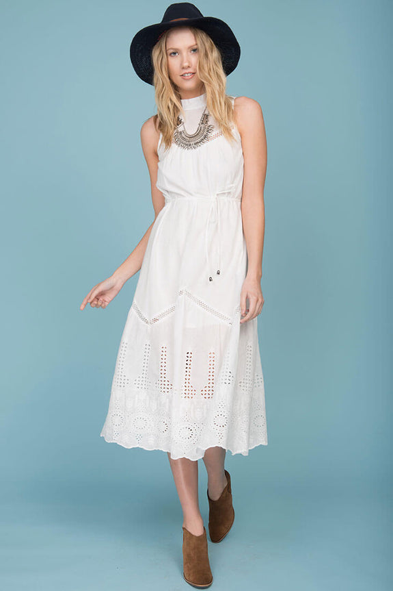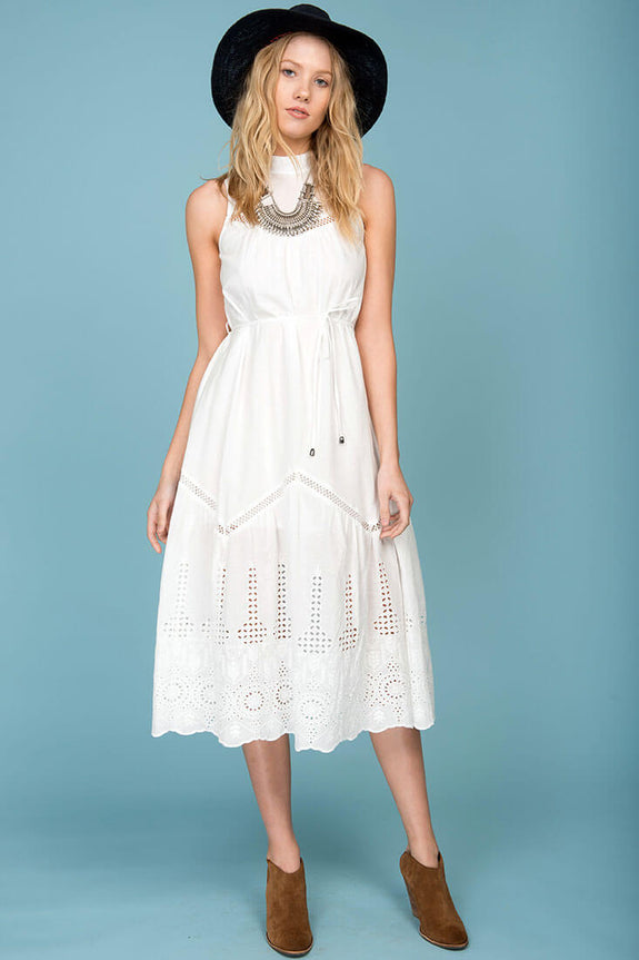 Modest and chic, the Bentley chic summer midi dress with halter neckline and eyelet cutouts is the frock of your dreams! Wear with brown booties and fun jewels.
