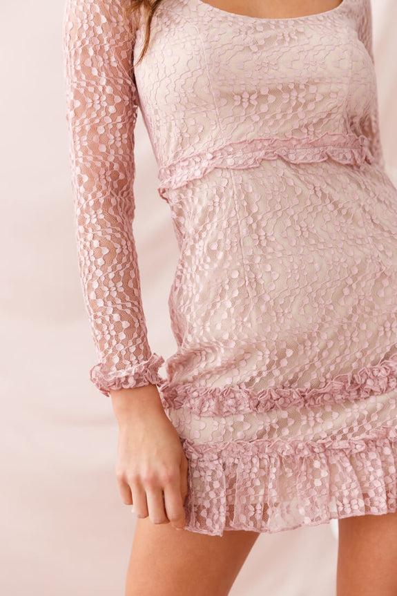 You've never looked so sweet and innocent in our adorable Birkin dress. Featuring delicate embroidered fabric, a flattering scoop neckline and the sweetest ruffle-trim hemline that's repeated around the waist and wrists for an extra touch of femininity. We are loving the peek-a-boo style back that shows just a hint of skin. Pair it with on-trend clear pvc heels for a modern twist.