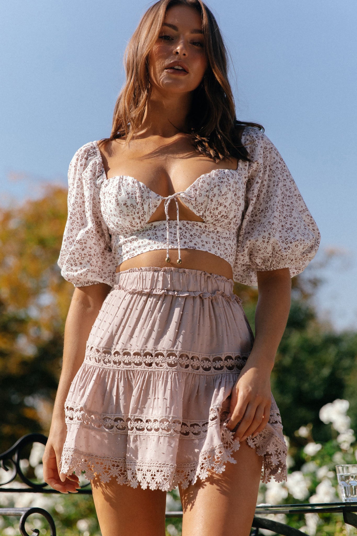 You'll fall in our love with our romantic Blanche skirt. Perfect for a flirty first date, we are loving the floral lace inserts and delicate hail-spot textured fabric. Team it with wedges and a crop top for a cute look we are loving.