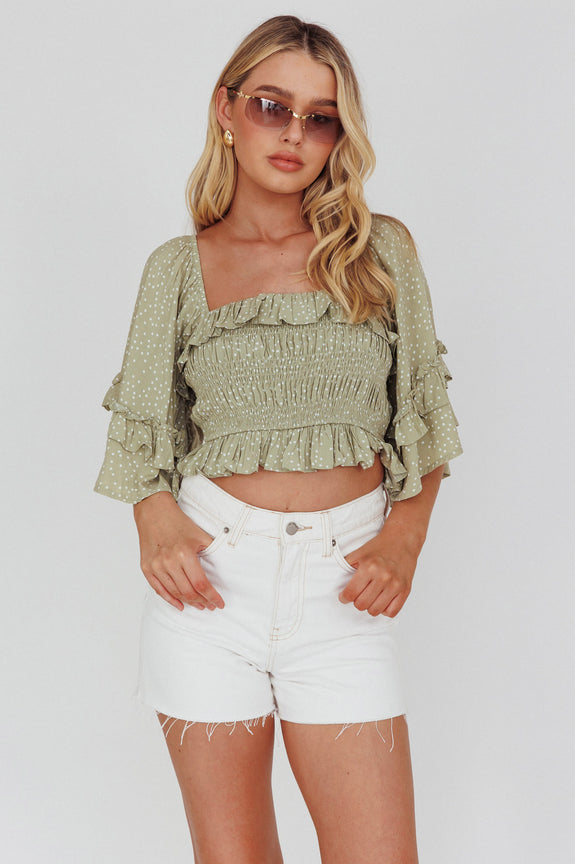 Hey there, cutie! You are getting all the attention in our Boardwalk crop top. Featuring bell sleeves and a shirred bodice. Perfect for a flirty first date teamed with jeans, boots and a tote for a look we are loving.