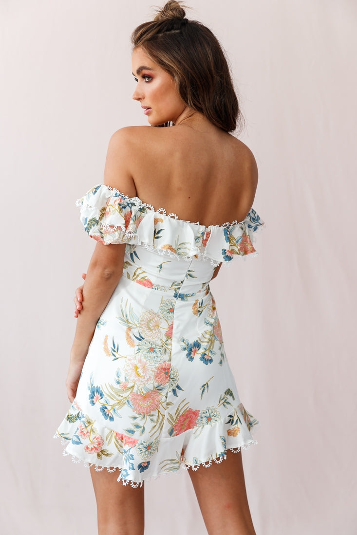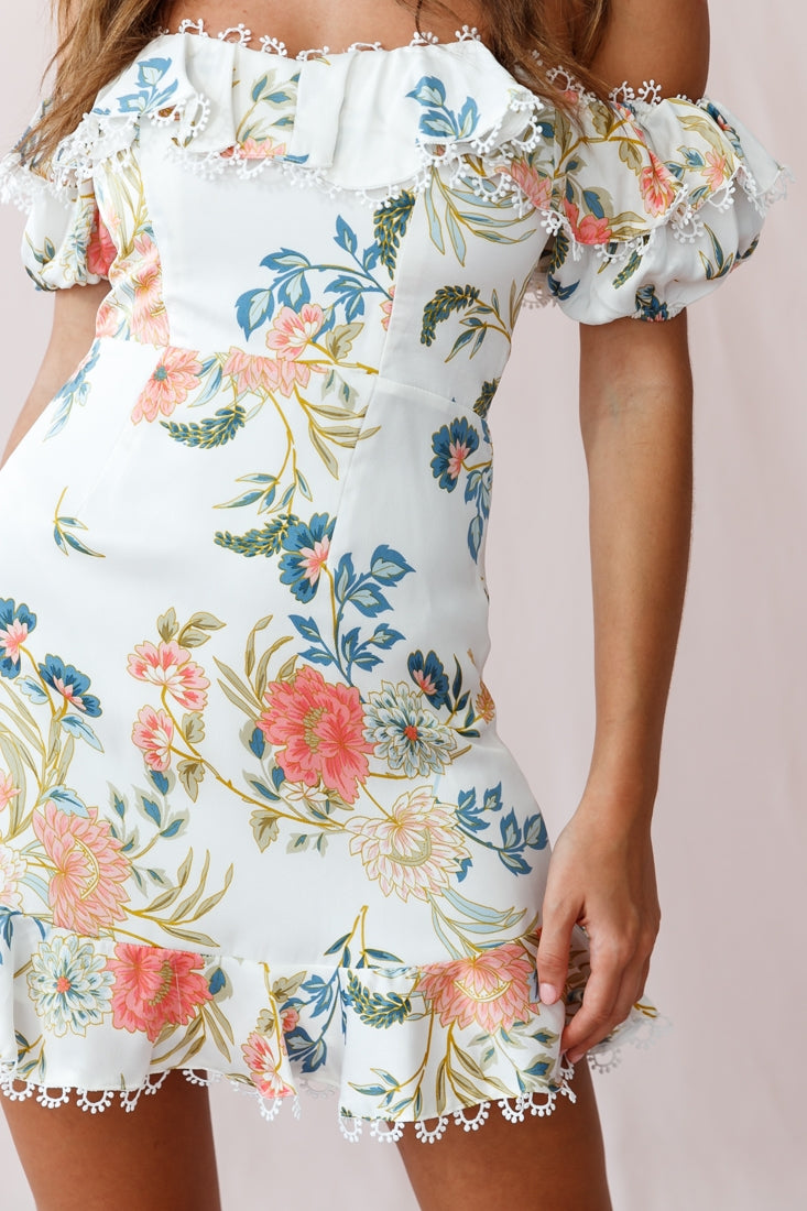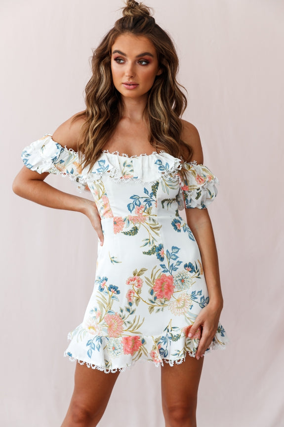 Sugar couldn't make you any sweeter in our pretty Bobby dress. Featuring an on-trend ruffle-trimmed Bardot neckline with puff sleeves and pretty embroidery trim, darling floral print and fluted hem. It's perfect for a first date or girls' day out. Pair it with beige mules and hoop earrings for a look we are loving.