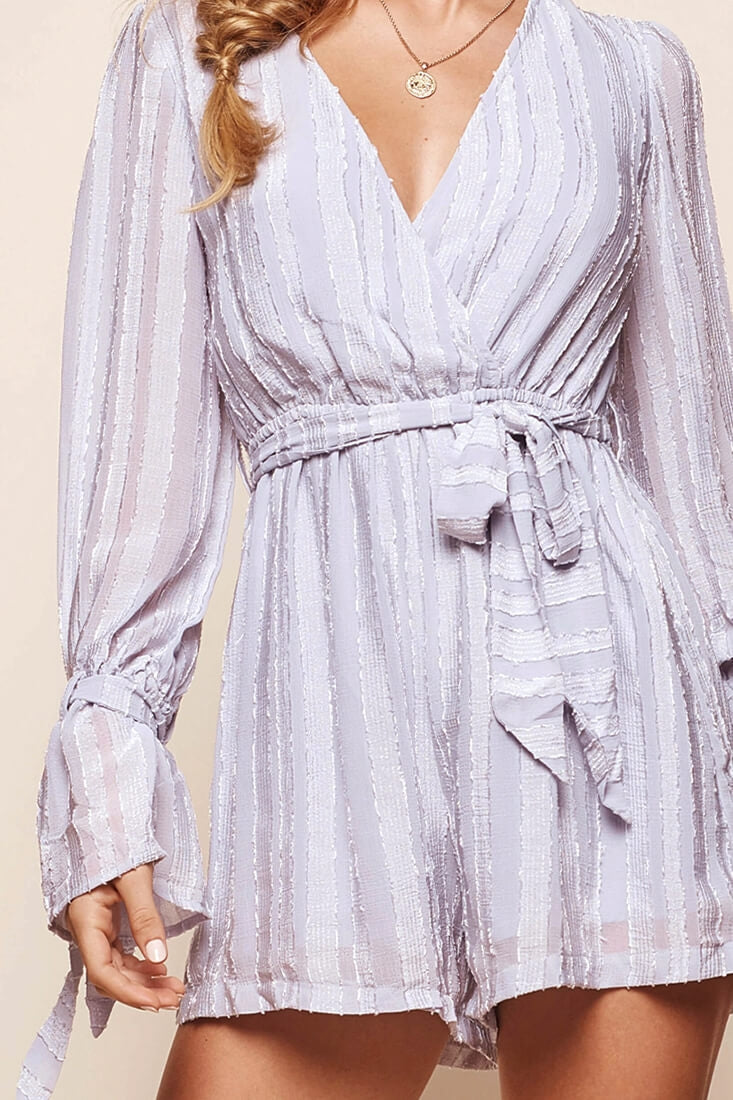 Ooze feminine 70's style in this stunning romper. Featuring an elasticated waist, belt-loop ribbon waist tie and button-fastening at the back. We love the soft chiffon fabric with frayed-edge textured stripes. Team it with some oversized retro sunglasses and platforms. Groovy baby!
