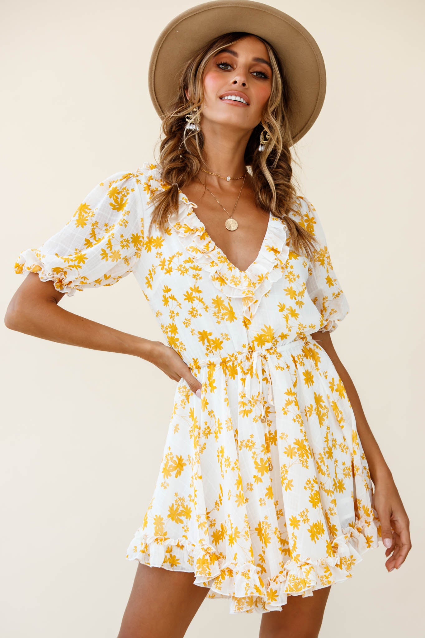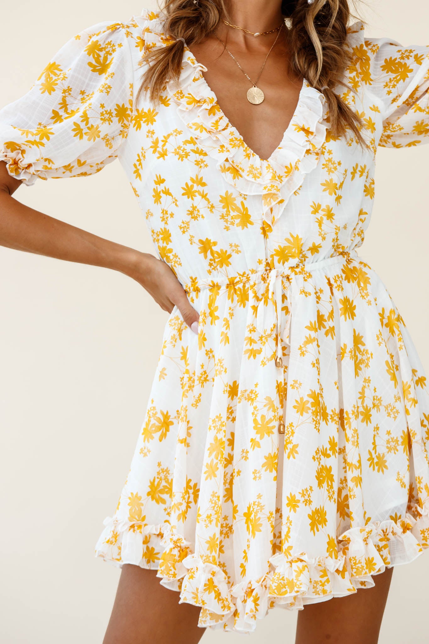 Brianna Puff Sleeve Drawstring Waist Dress Floral Print Yellow