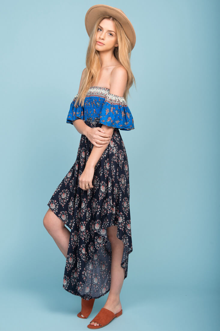 Unsuspecting jumpsuit design and exotic off-the-shoulder look shines into a new era. Wear with cool sandals.