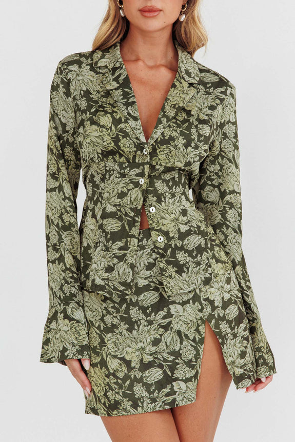Caledonia Collared Button-Up Satin Shirt Floral Olive