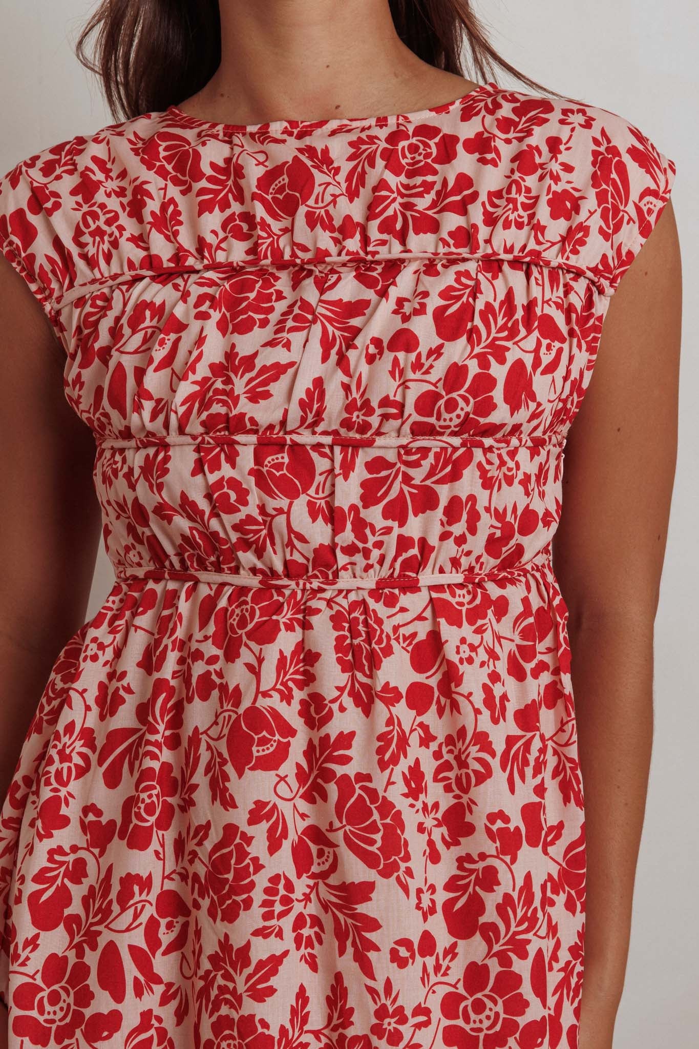 - Gathering detail in bodice
