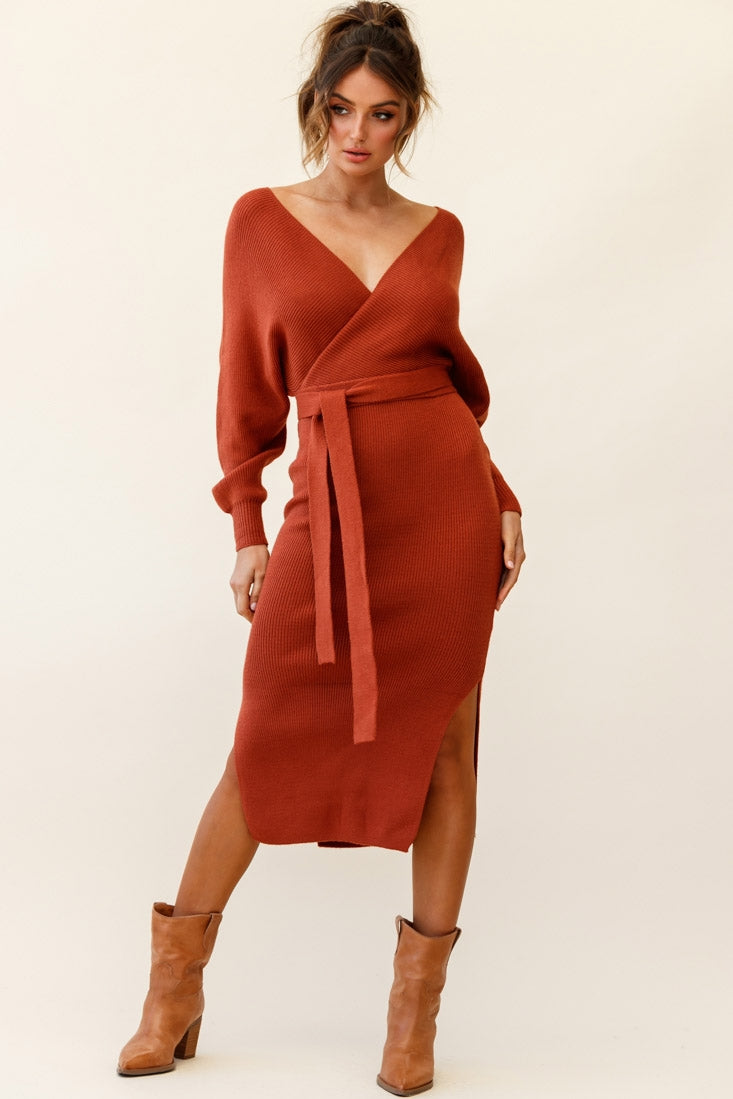 Snag yourself a cutie in our cozy but sexy Cameo dress. Featuring soft, knit fabric, long batwing sleeves, flattering crossover neckline and belted waist tie. We are loving the midi length with splits on either side. Perfect for snuggling up by the fire with a glass of wine, post romantic dinner date. Team it with boots and a beret for a cozy look we are loving.