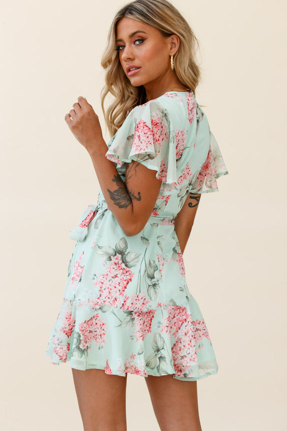 Cami Angel Sleeve Faux Wrap Dress Hydrangea Print Mint/Pink