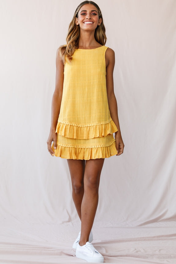 Twirl through your day in our playful Candice shift dress. Featuring a tiered frill and lace trim around the hem and a gorgeoud scooped back. It's perfect for catching up with your girls for lunch and the latest goss. Team it with canvas wedges and a woven straw bag for a casual-chic look we are loving.