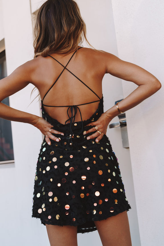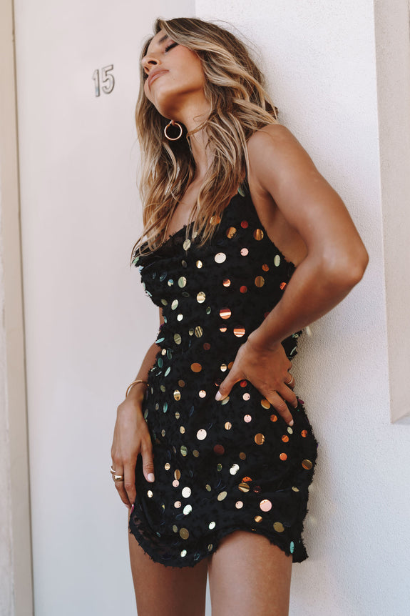 Hey there, cutie! You are turning heads tonight in our gorgeous Candid Moment dress. The sequin embellishment will light up the night as you twirl your way across the dance floor. Perfect for a girls' night out teamed with strappy black heels and a purse.