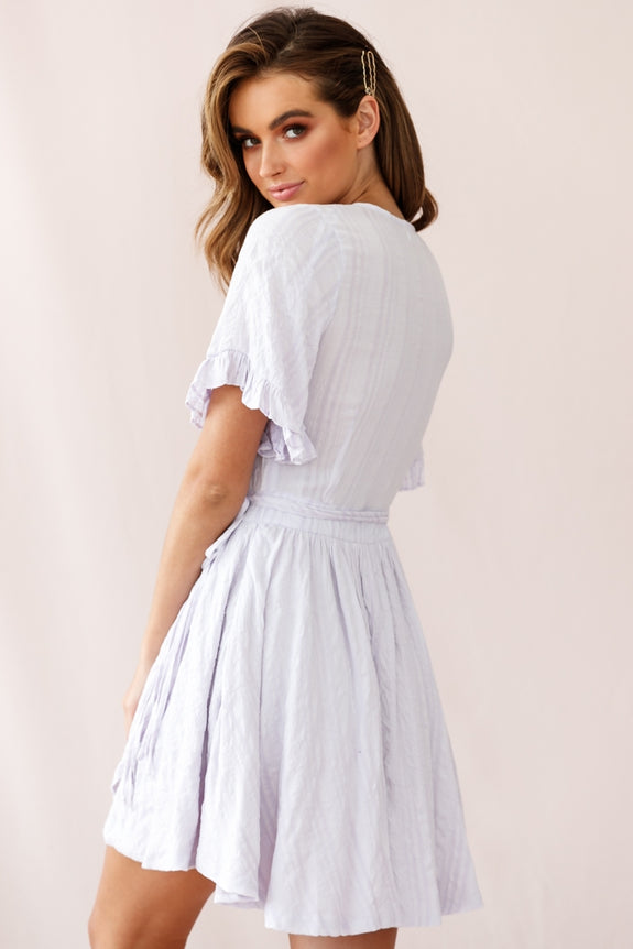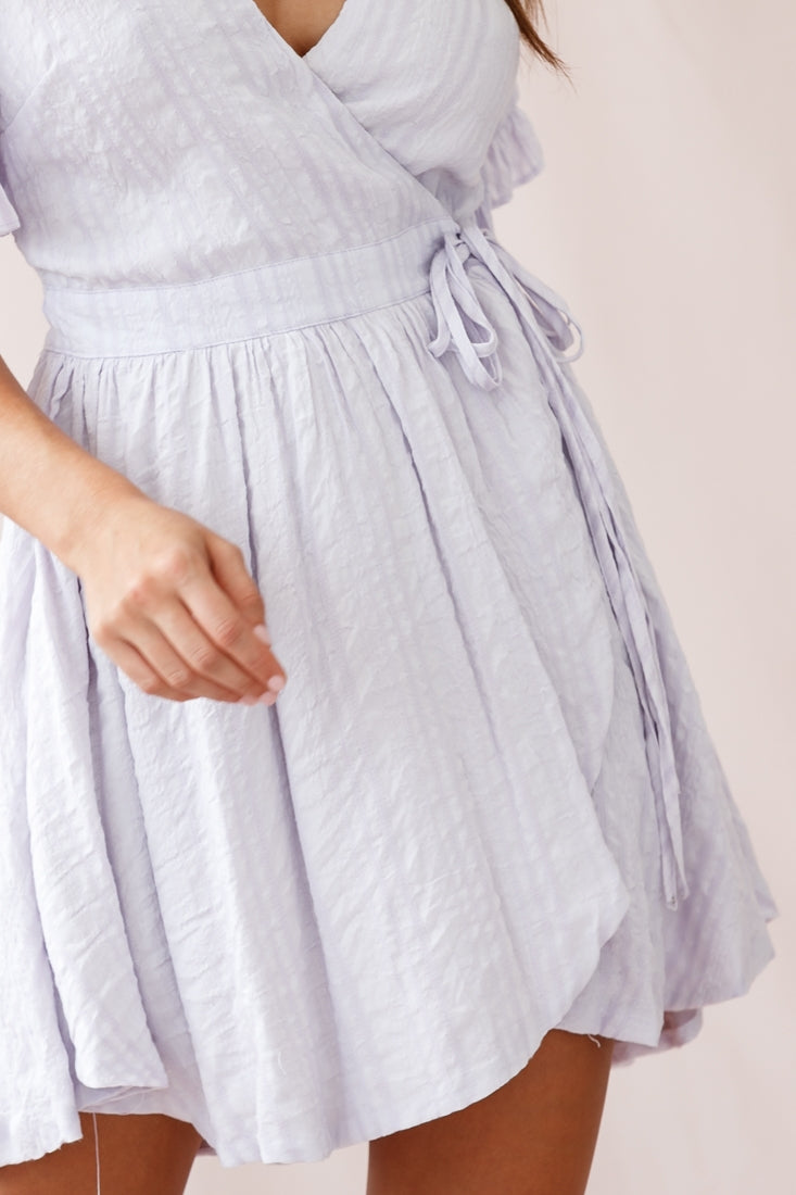 Turn heads in our super cute Cara dress. Partially lined, it features a wrap style that ties at the waist, frill-trimmed sleeves and an asymmetrical hemline. Perfect for work or play teamed with pointed toe slides and a tote.