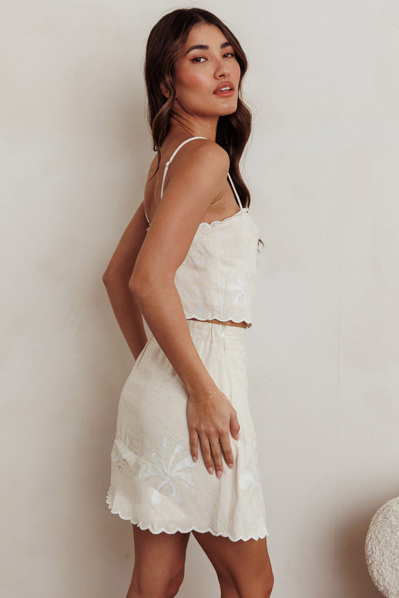 Twirl the day away in our super cute Carsyn cropped top. We are in love with its scallop edges and floral embroidery detail. Perfect for Sunday mimosa brunches with your besties or a fun picnic date with your partner. Complete the look with it's matching skirt for effortless styling!