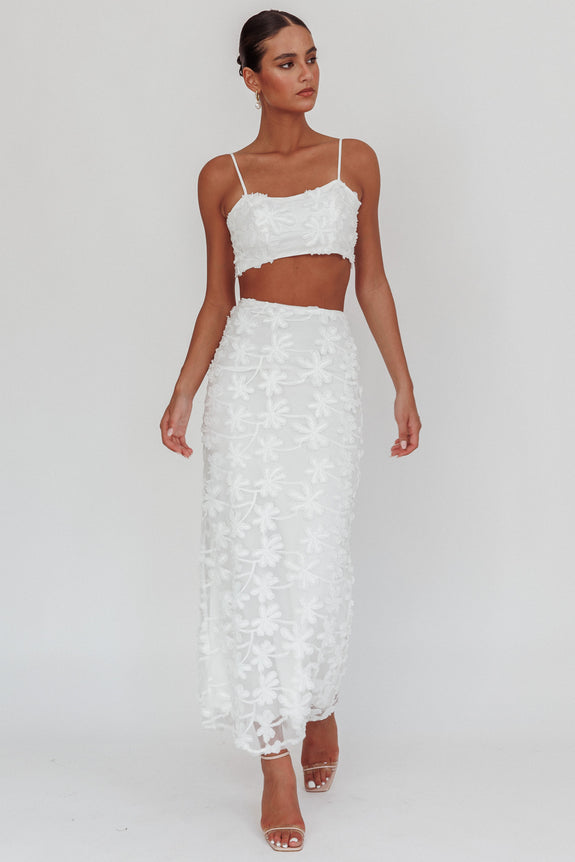 Make your grand entrance in our super chic Casi skirt. It features embroidered palm trees throughout and a maxi length. It's perfect for a bridal shower or a special event. Team it with its matching crop top and strappy, nude heels for a look that will have you flooded with compliments.