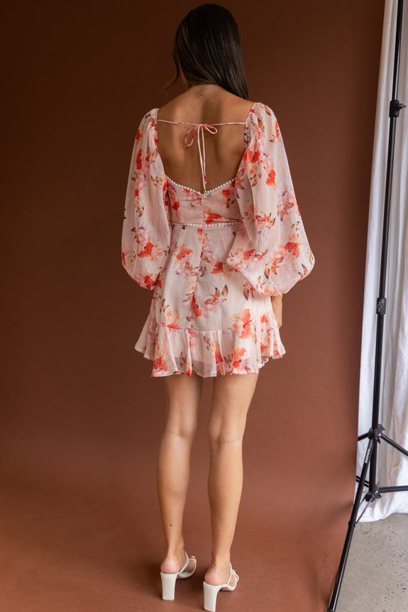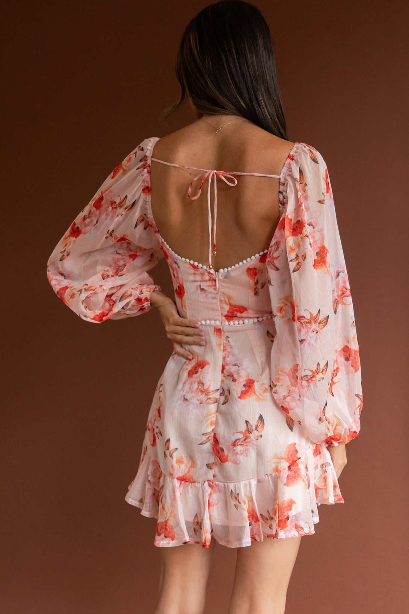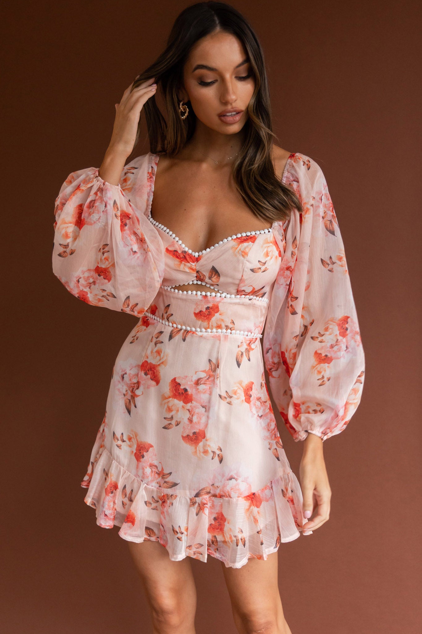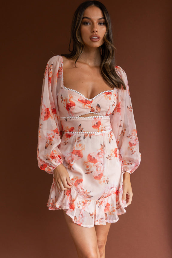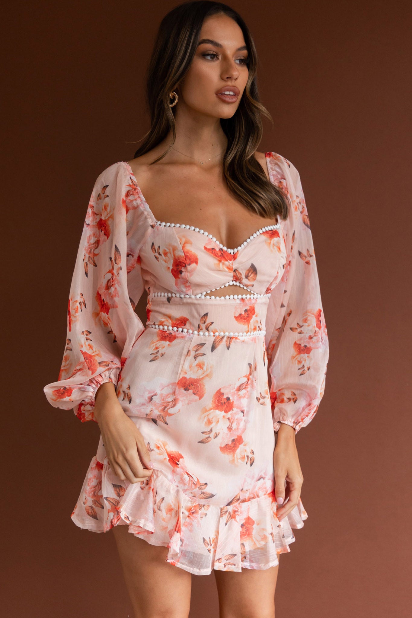 Catch Feelings Sweetheart Neckline Dot Trim Dress Rose Print Orange
