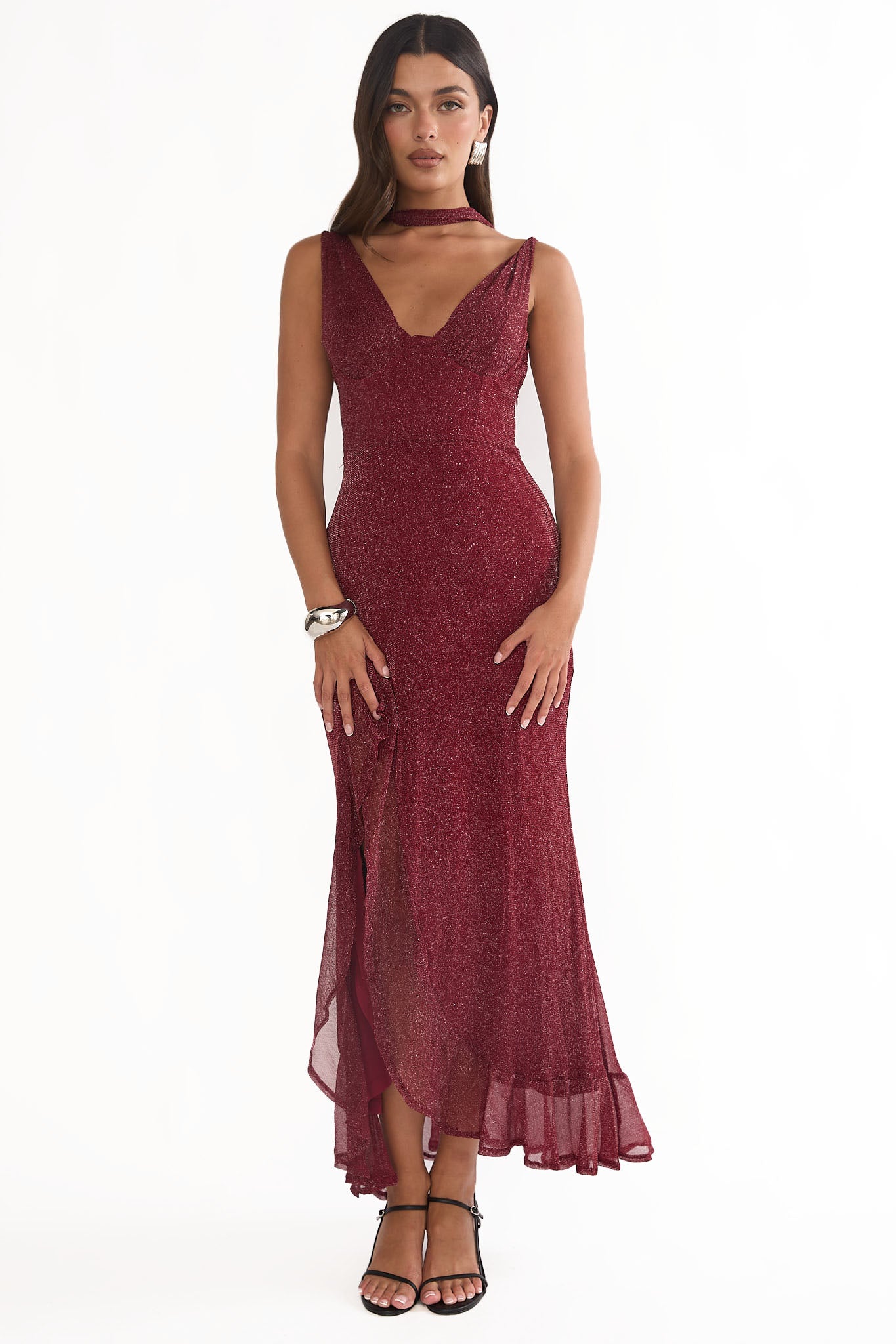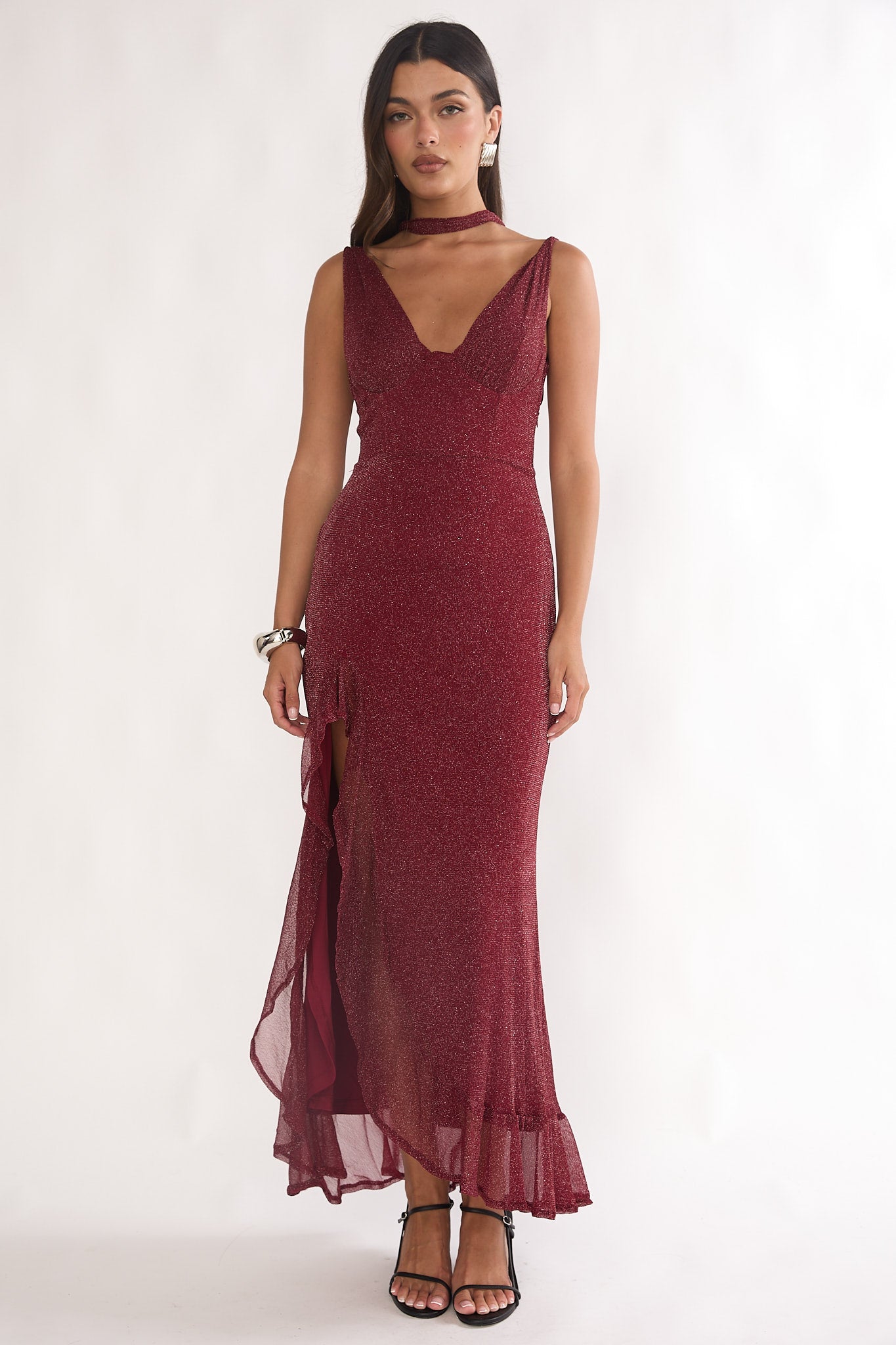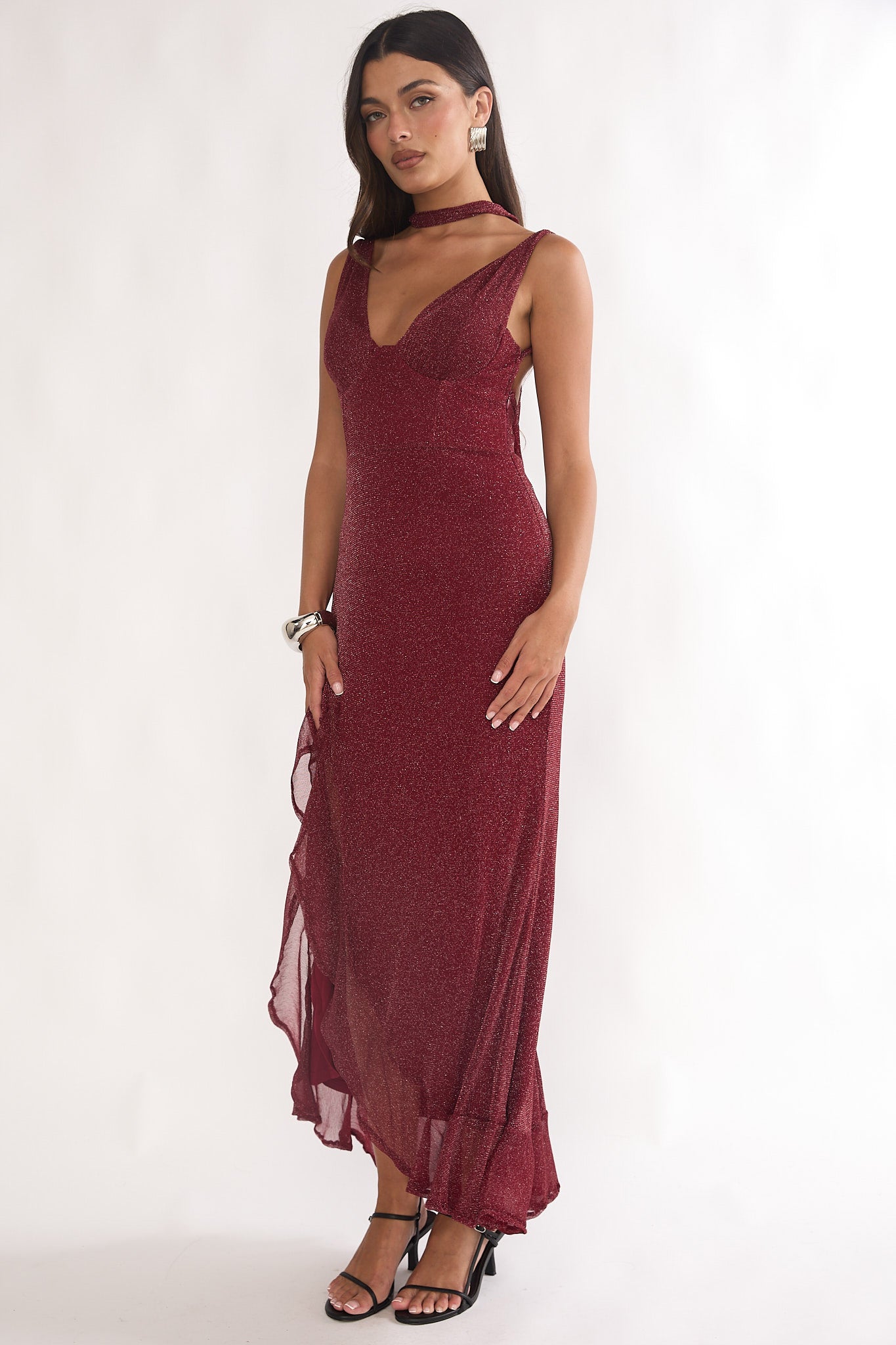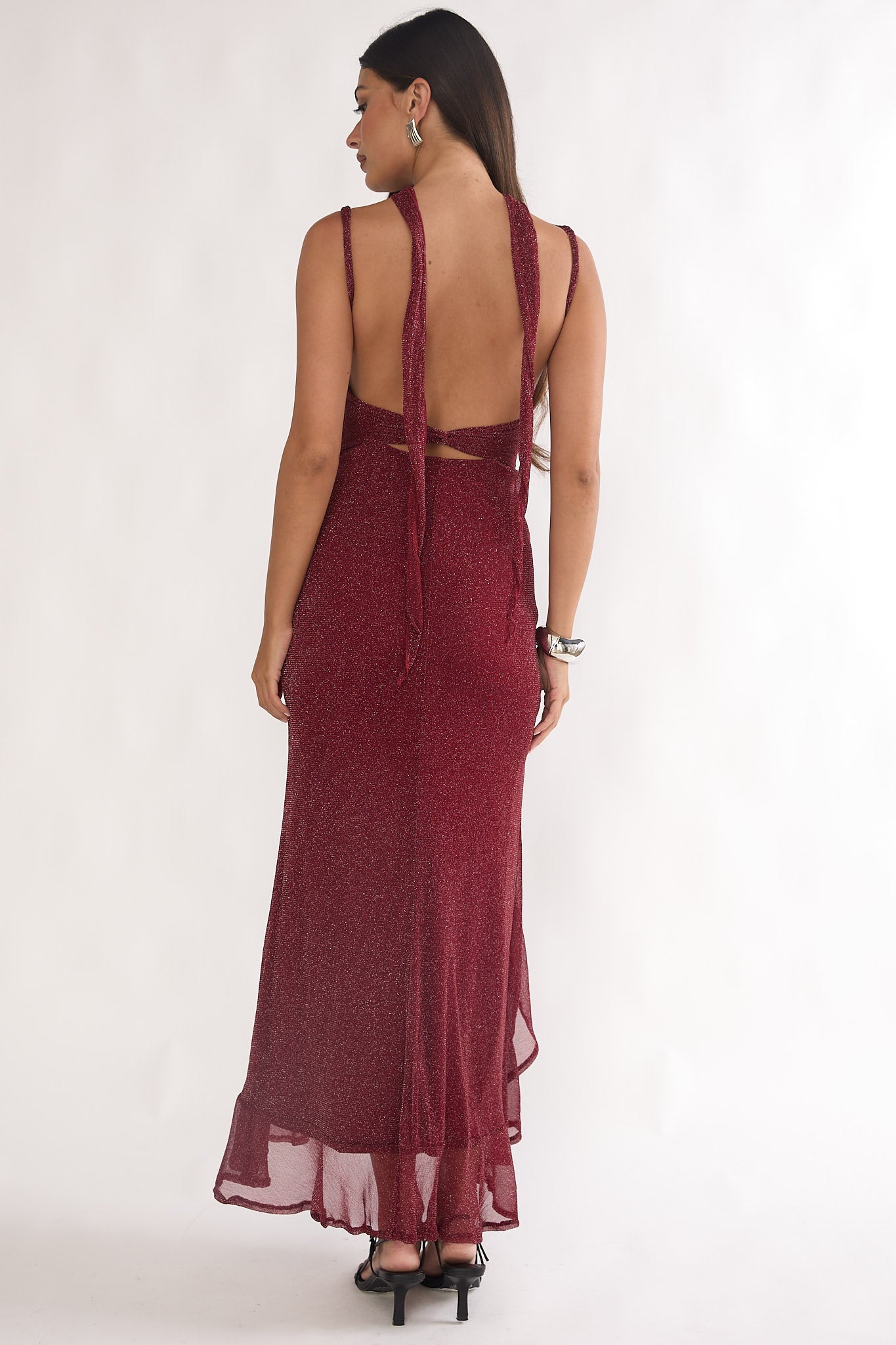 Make an entrance in our stunning Chantrelle maxi dress. We are obsessed with its shimmering fabric and twist detail in the back. It's just what you need for a holiday party or special event. Team it with silver heels and a clutch for a head-turning look.