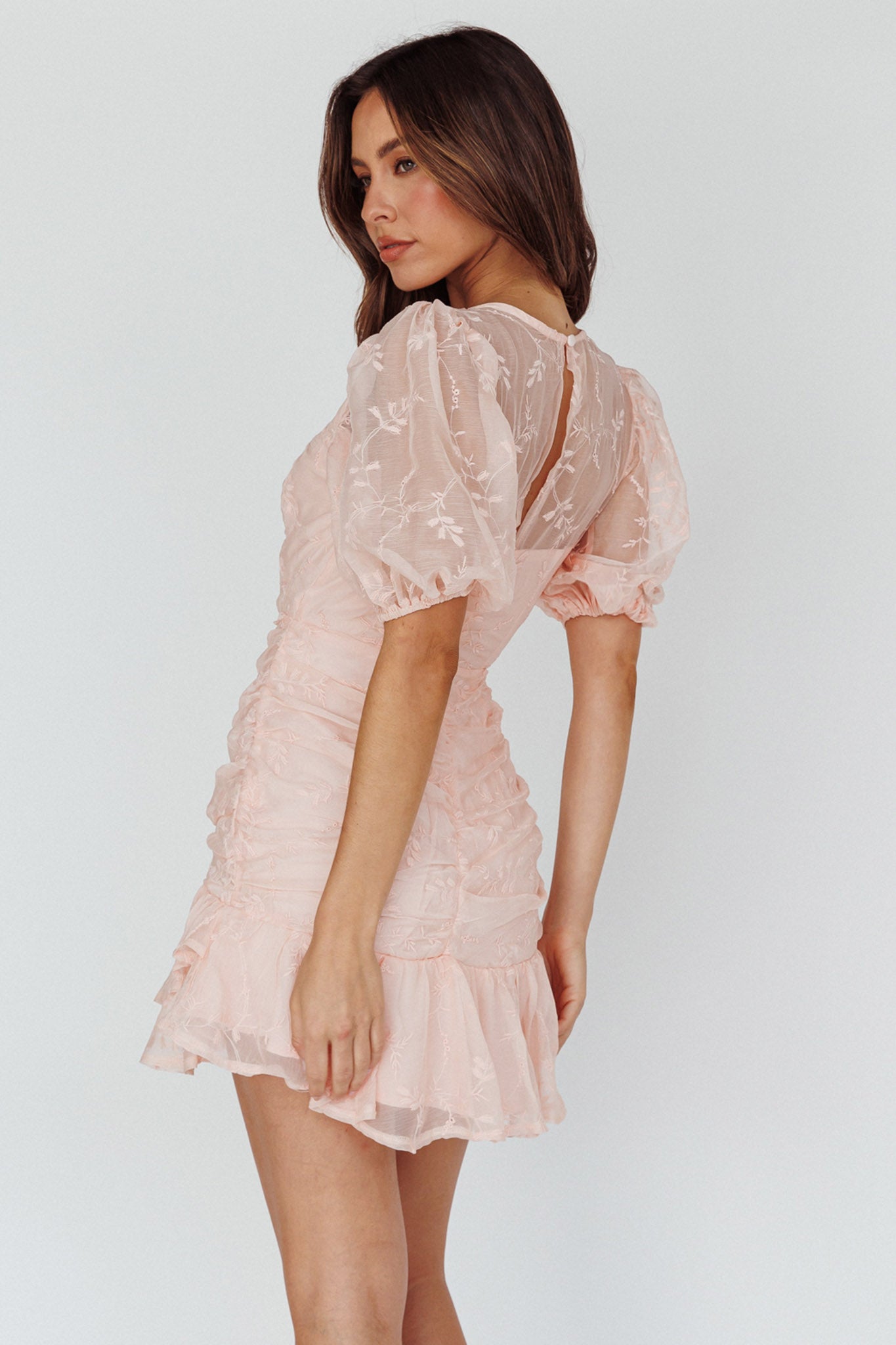Cherry Blossom Puff Sleeve Wide Ruffle Hem Dress Pink
