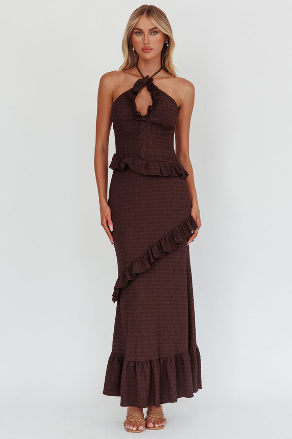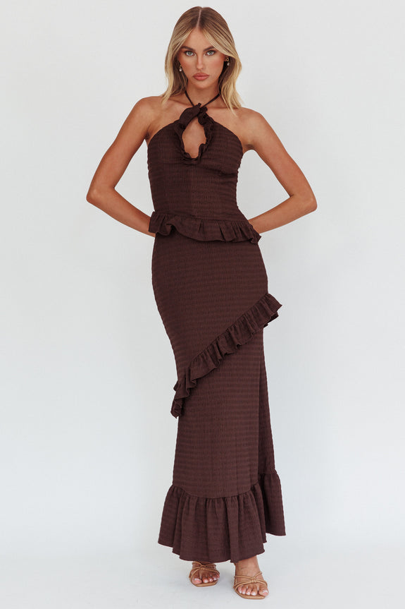 Clemence Smocked Frill Trim Maxi Dress Chocolate
