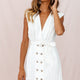 Make an entrance in our adorable Clementine dress. Featuring super cute, short, rolled sleeves, deep V-neckline, placket style skirt with wooden buttons, a separate belt and a unique key-hole, cut-out back. Team it with fresh white sneakers and a head scarf for a playful look we are loving.
