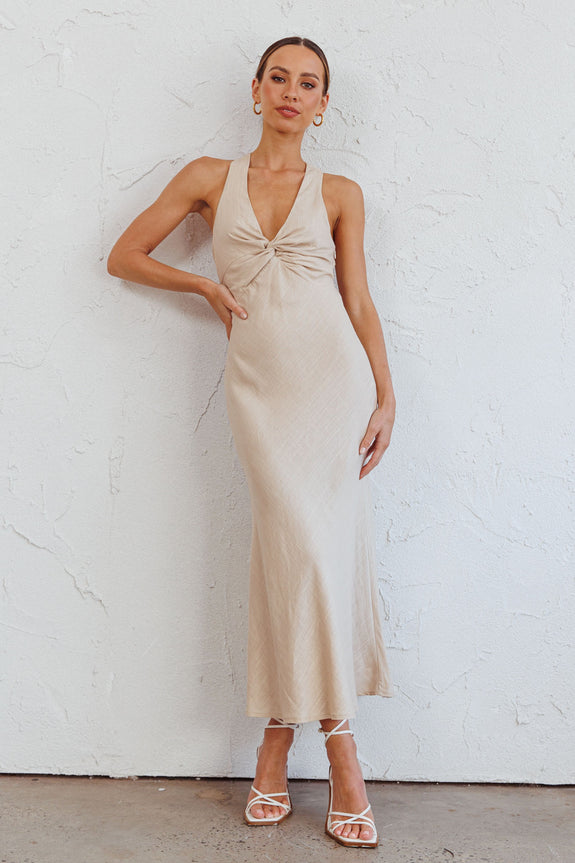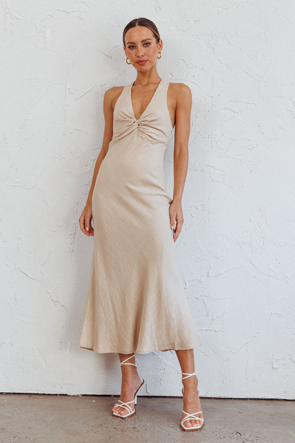 Float on by in our classic Coastal Charm midi dress. Featuring a twist detail in the back and bust, it's perfect for dinner dates with your girls teamed with mules and a tote for a feminine look we are loving.