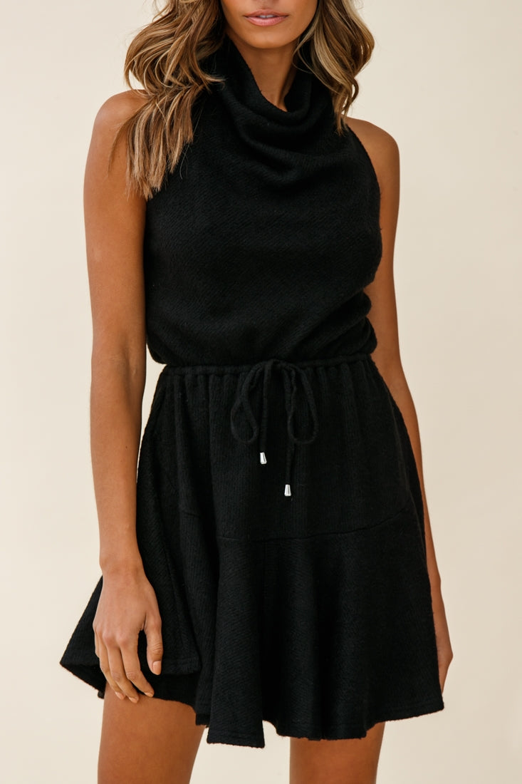 Slay those Fall days in our cute Cosette dress. Featuring a soft knit fabric throughout, high cowl halterneck style, drawstring around the waist and fluted hem. Perfect for a movie date with bae teamed with boots for a super cute look we are loving.