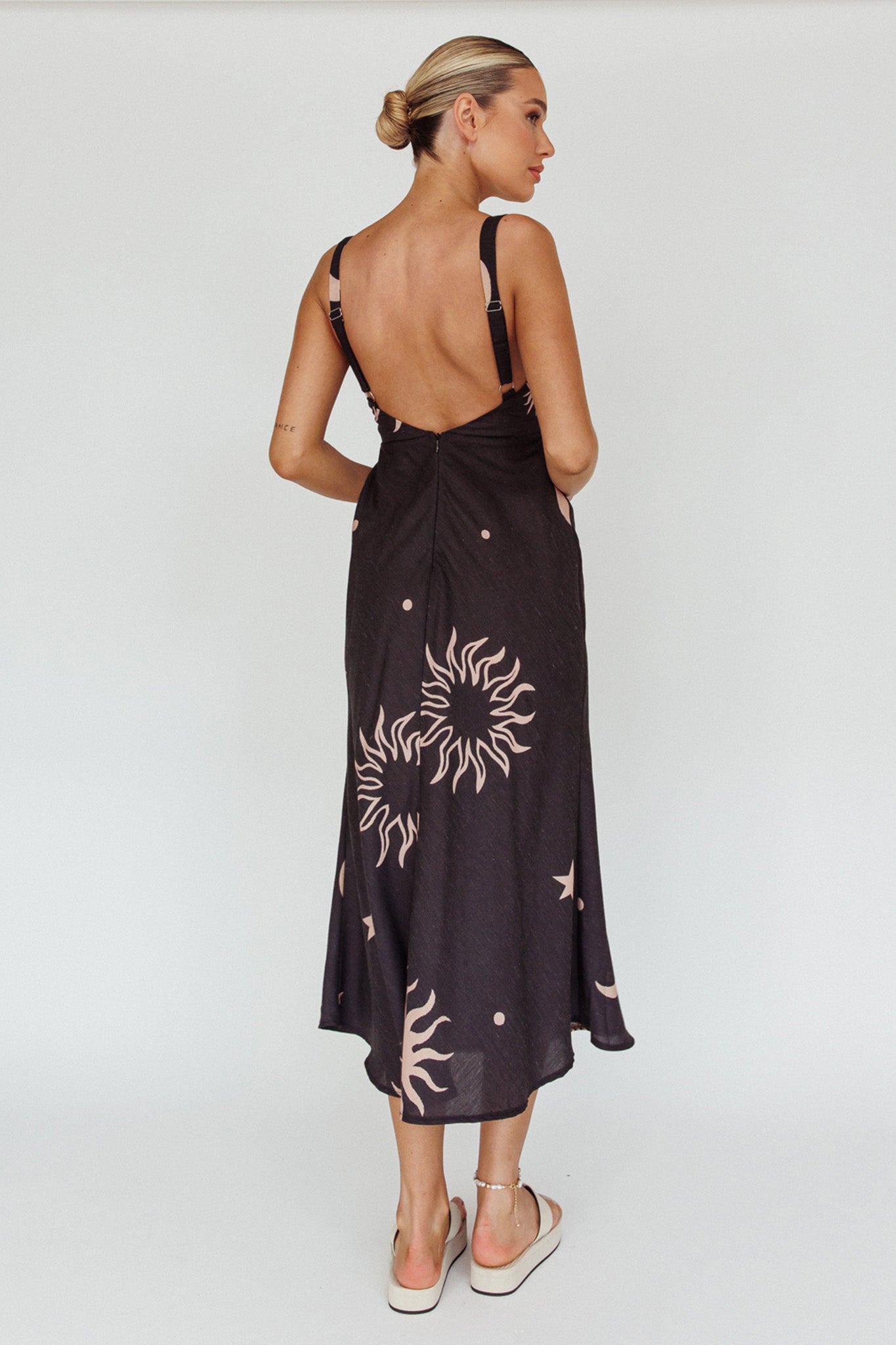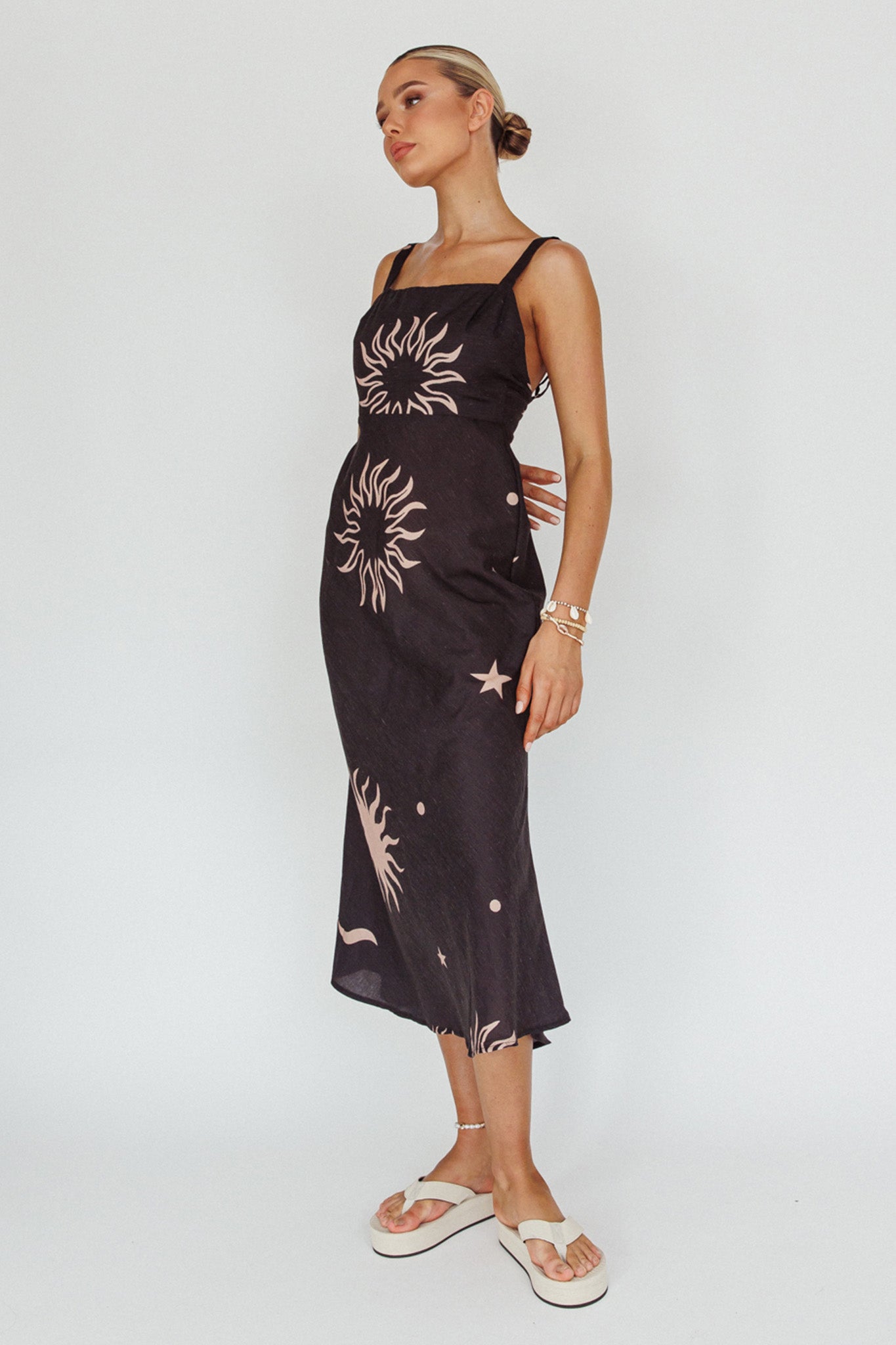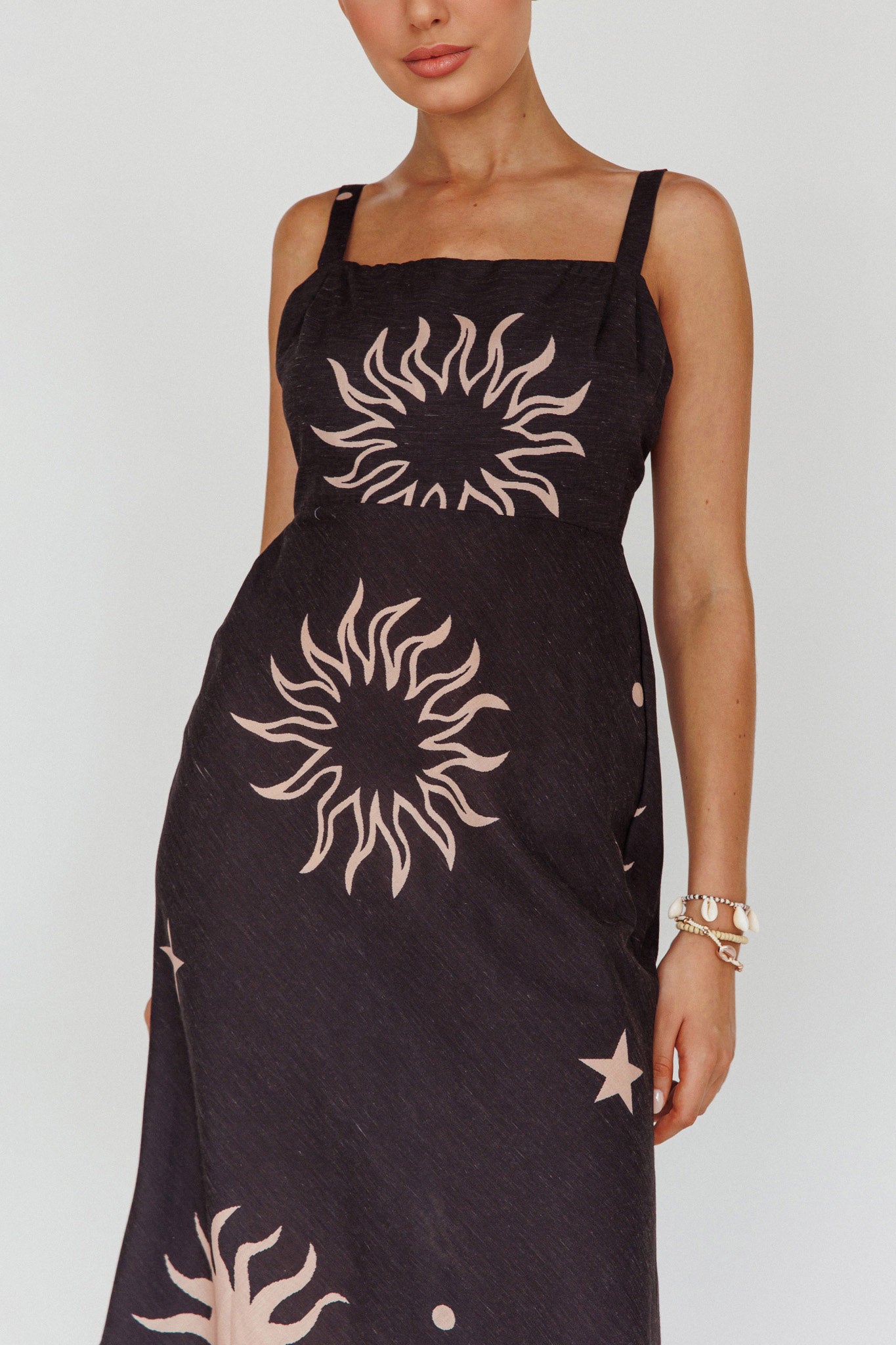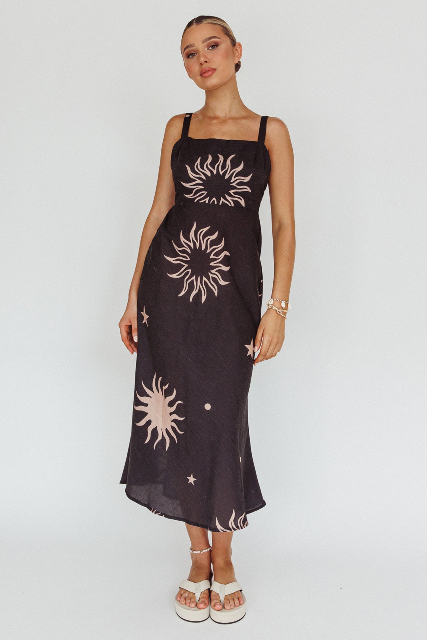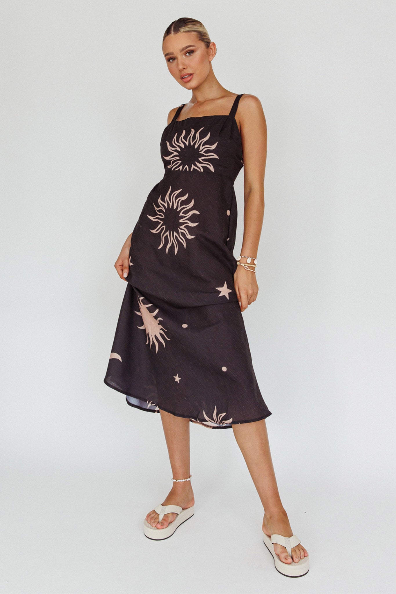 Say hello to our gorgeous Coucou midi dress. Featuring a breezy silhouette and cute celestial print. It's perfect for weekend coffee dates with your bff's. Team it with sandals and a straw tote for a look we are loving.