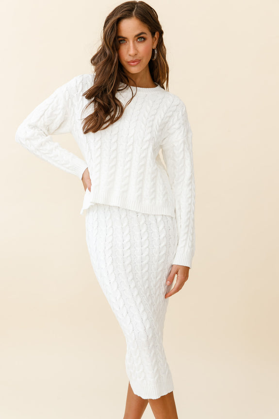 Snuggle up in our Cozy Up sweater. Featuring a pretty cable knit and gorgeous apple green shade. We are loving this thrown over a collared button-up for that preppy-cool look. Team it with its matching midi skirt for an on-trend Fall look we are all about.