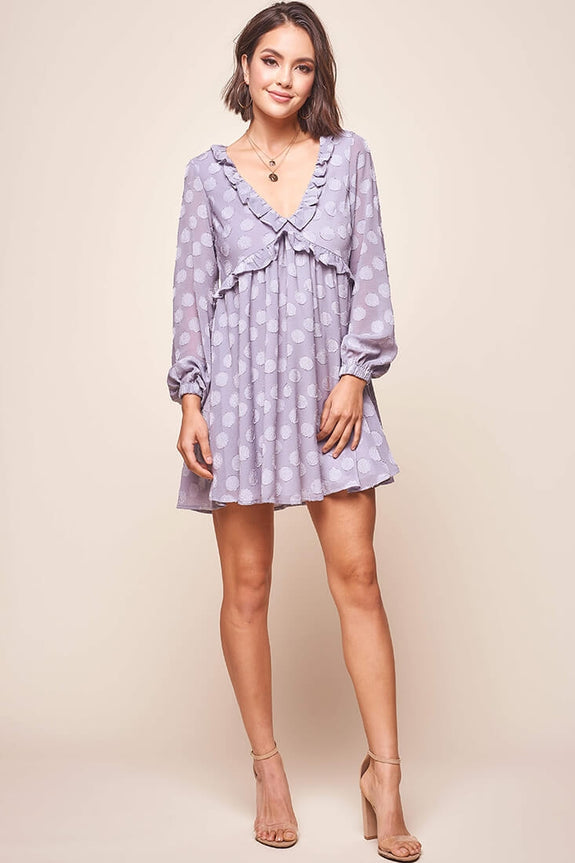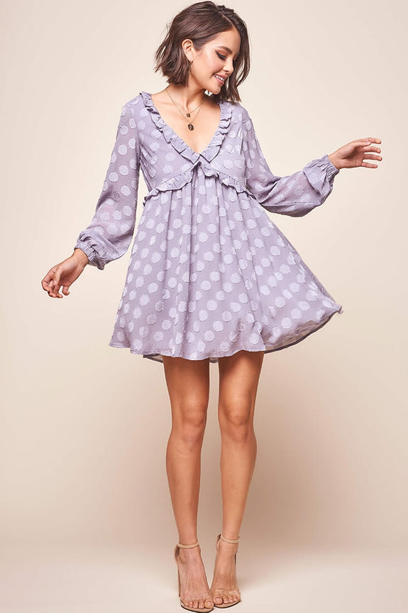 Float through your day in this breezy, feminine babydoll style dress. Perfect for a movie date with bae or lunch with your best gals, this dress features a mini length skirt, super cute ruffle detailing around the waist and neckline, long sleeves and pretty polka dot print fabric to complete the look. Pair it with sneakers for a casual look or dress it up with knee high boots and a jacket for a look that we are loving.