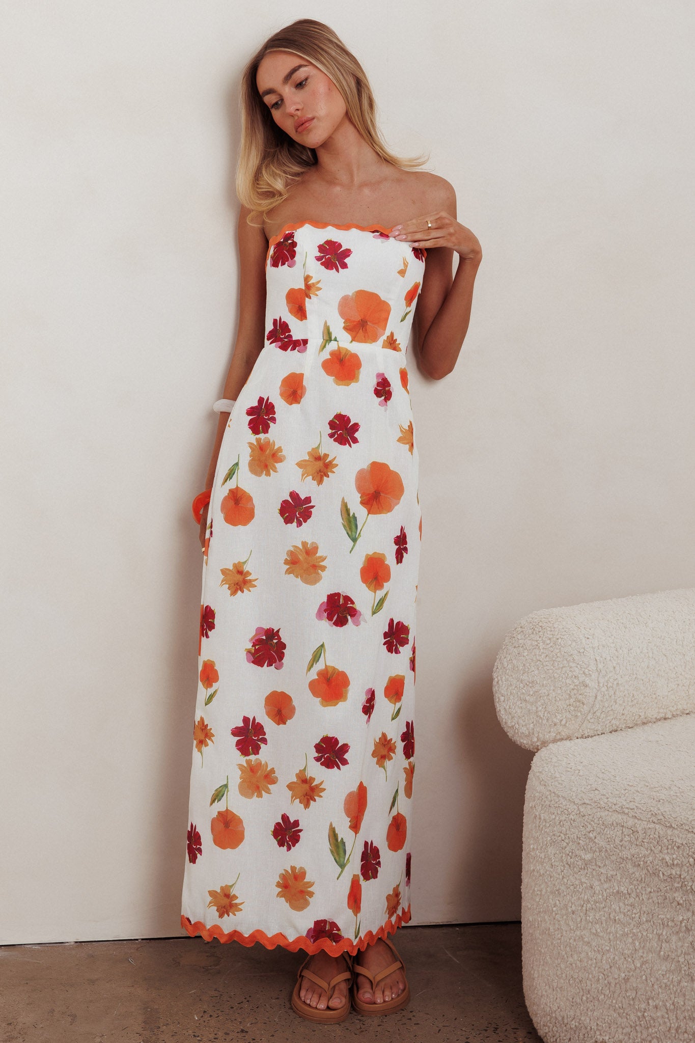 Cypress Ric Rac Trim Floral Strapless Maxi Dress Orange Multi