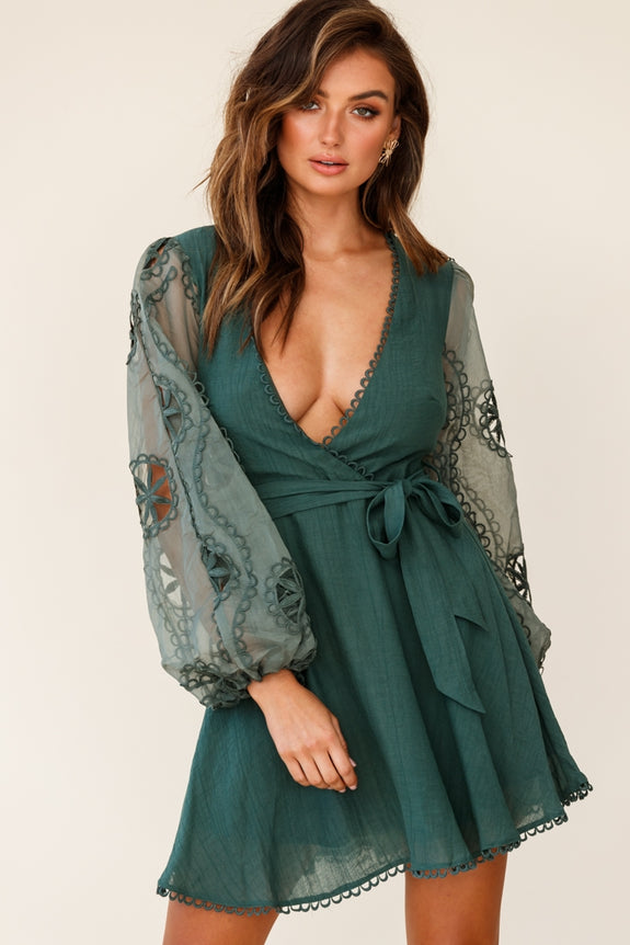 You'll be a style queen in our Dali dress. Partially lined, it features the prettiest embroidered chiffon balloon sleeves, surplice neckline, waist tie and zipper up the back. Wear it to a party or special occasion teamed with perspex heels and gold hoop earrings.