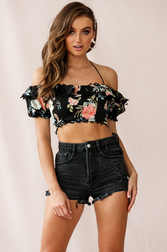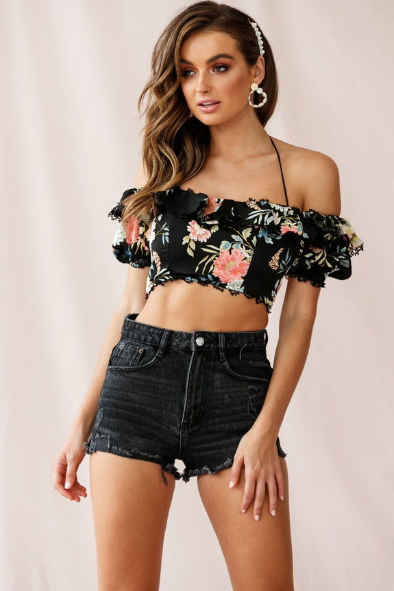Dallas Halterneck Ruffle Sleeve Crop Top Floral Print Black