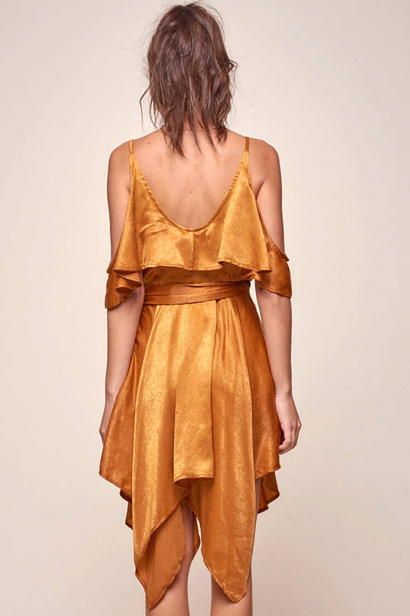 Daisy Buchanan has got nothing on you in the Darby Manhattan Off the Shoulder Dress! Shiny and beautiful fabric and asymmetrical hem line give you a flirty flair that grants a glamorous vintage style. Pair with golden high heels
