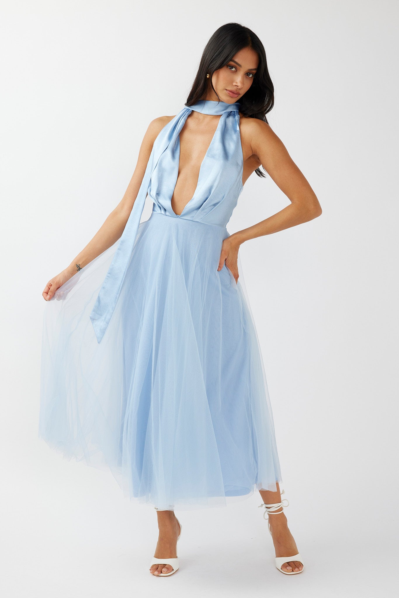 Steal the limelight in our stunning Darci midi dress. Featuring a pretty, tulle skirt and plunging neckline. It's perfect for a big birthday celebration or special occasion! Team it with nude heels and a clutch for an unforgettable look.