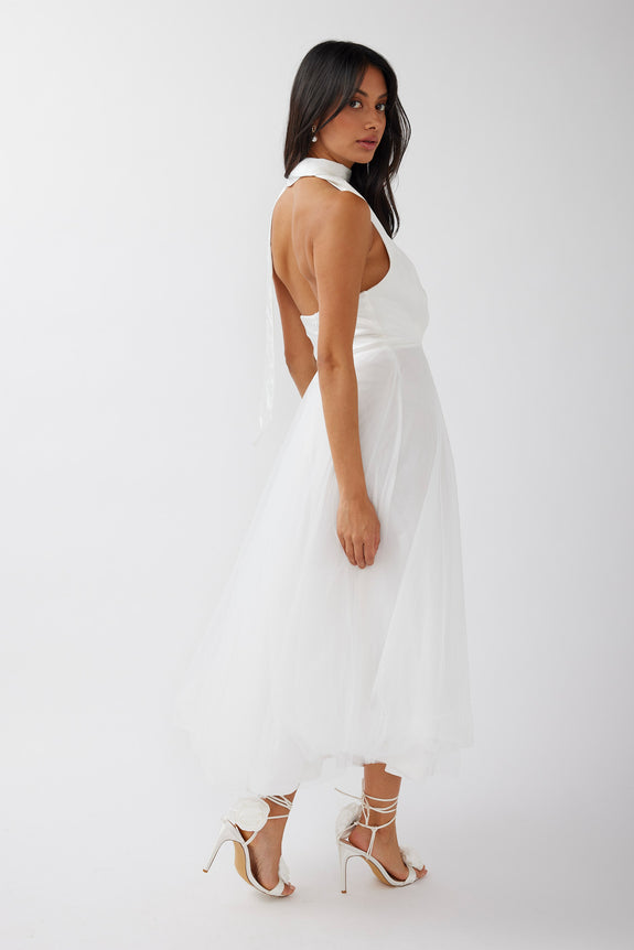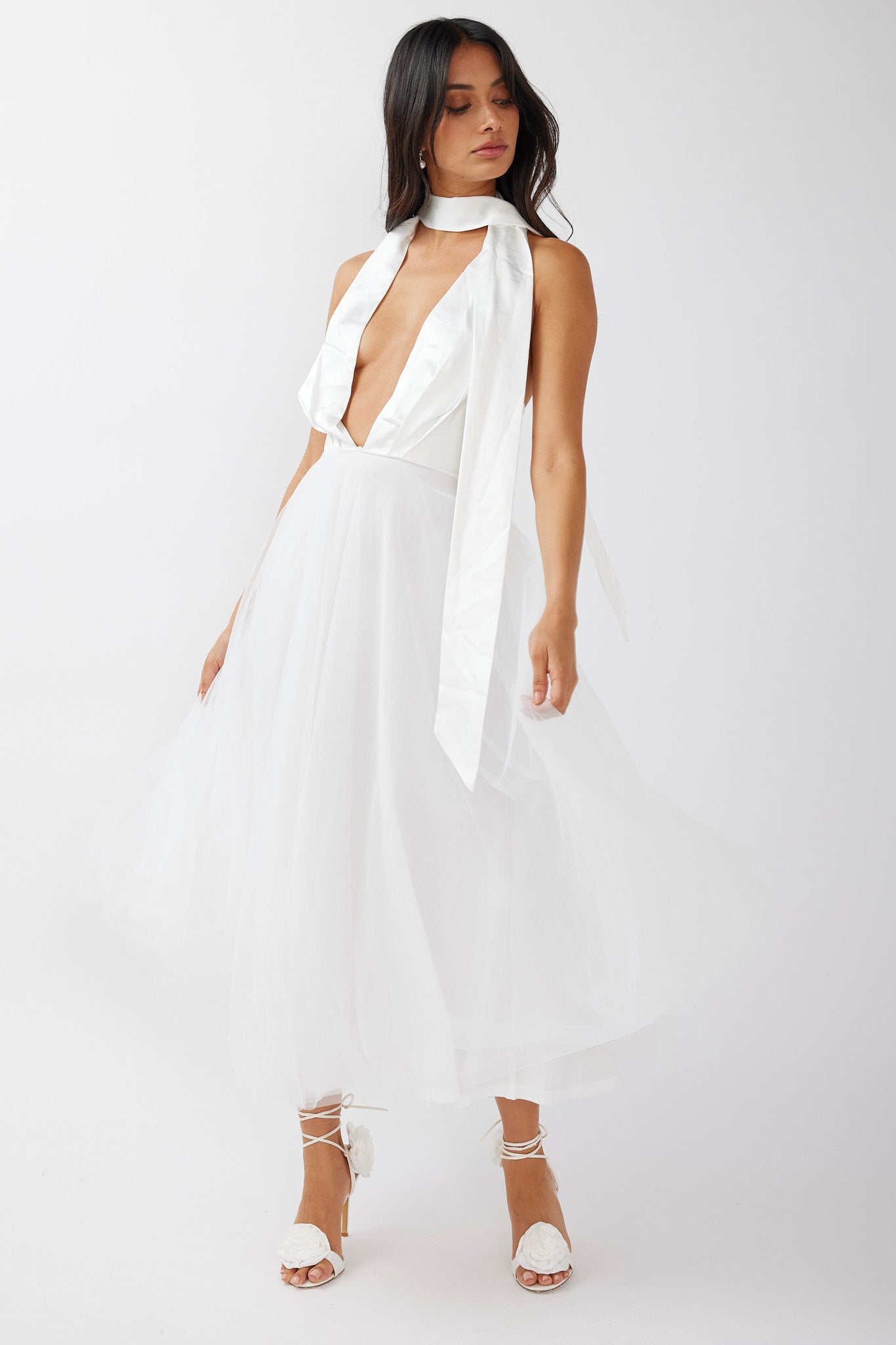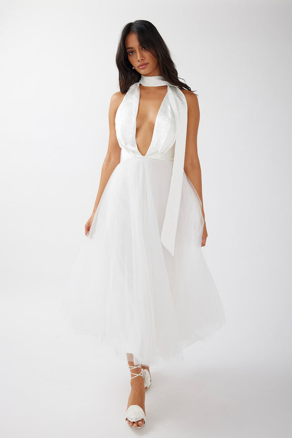 Steal the limelight in our stunning Darci midi dress. Featuring a pretty, tulle skirt and plunging neckline. It's perfect for a big birthday celebration or special occasion! Team it with nude heels and a clutch for an unforgettable look.