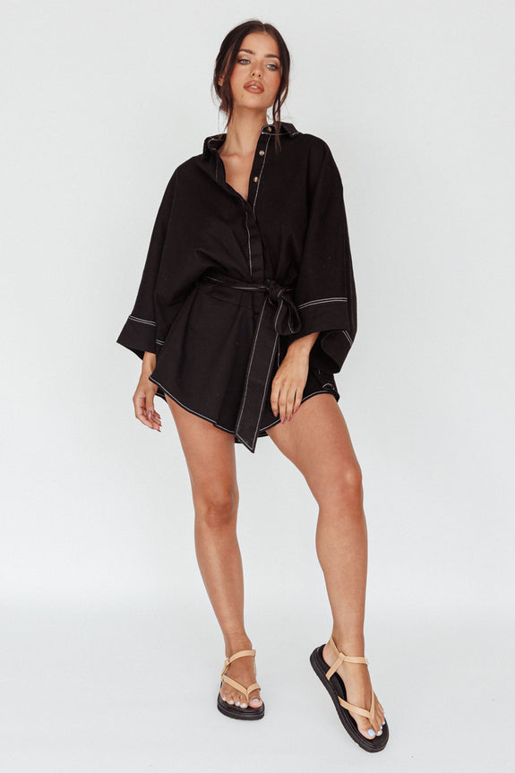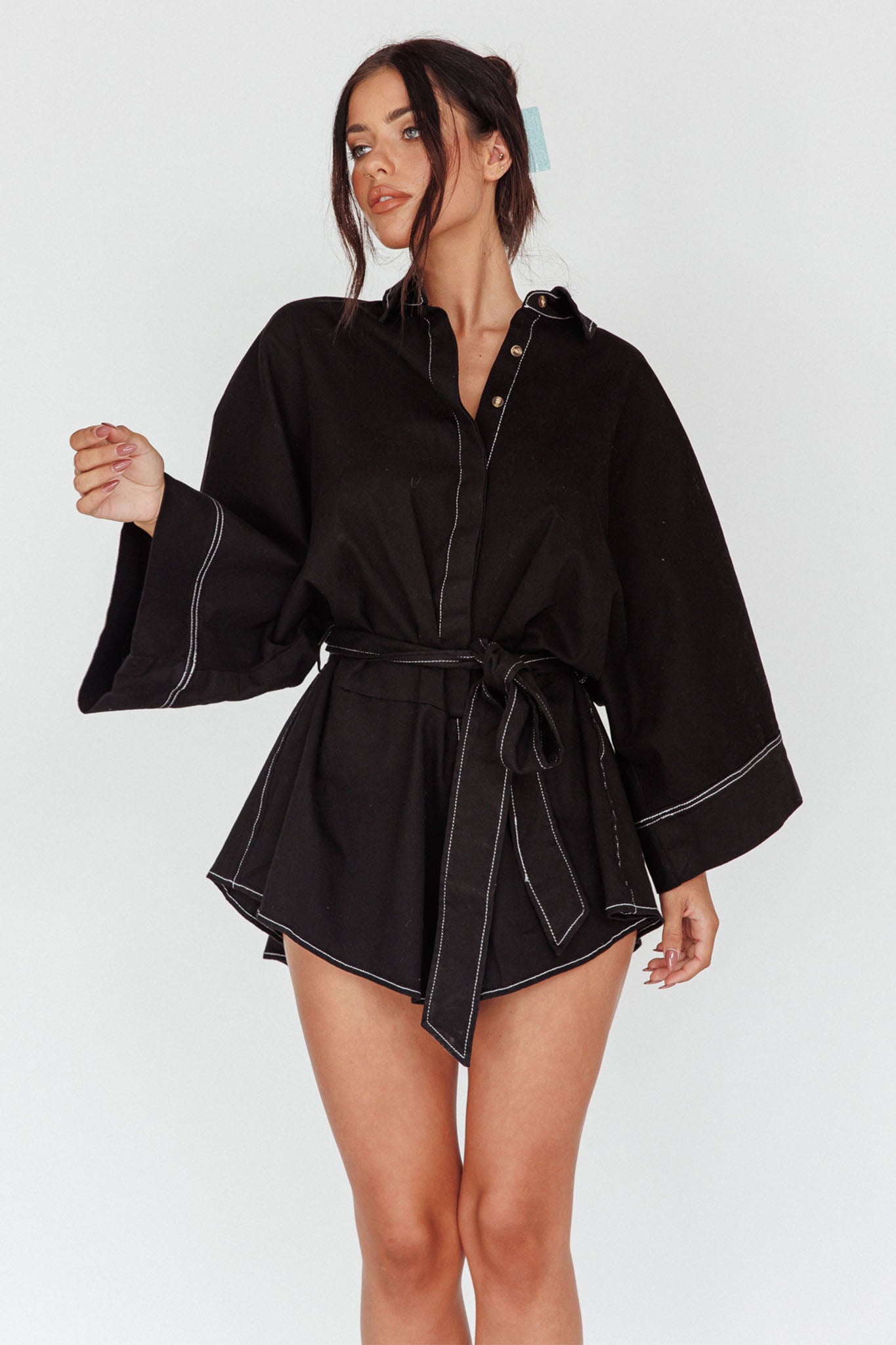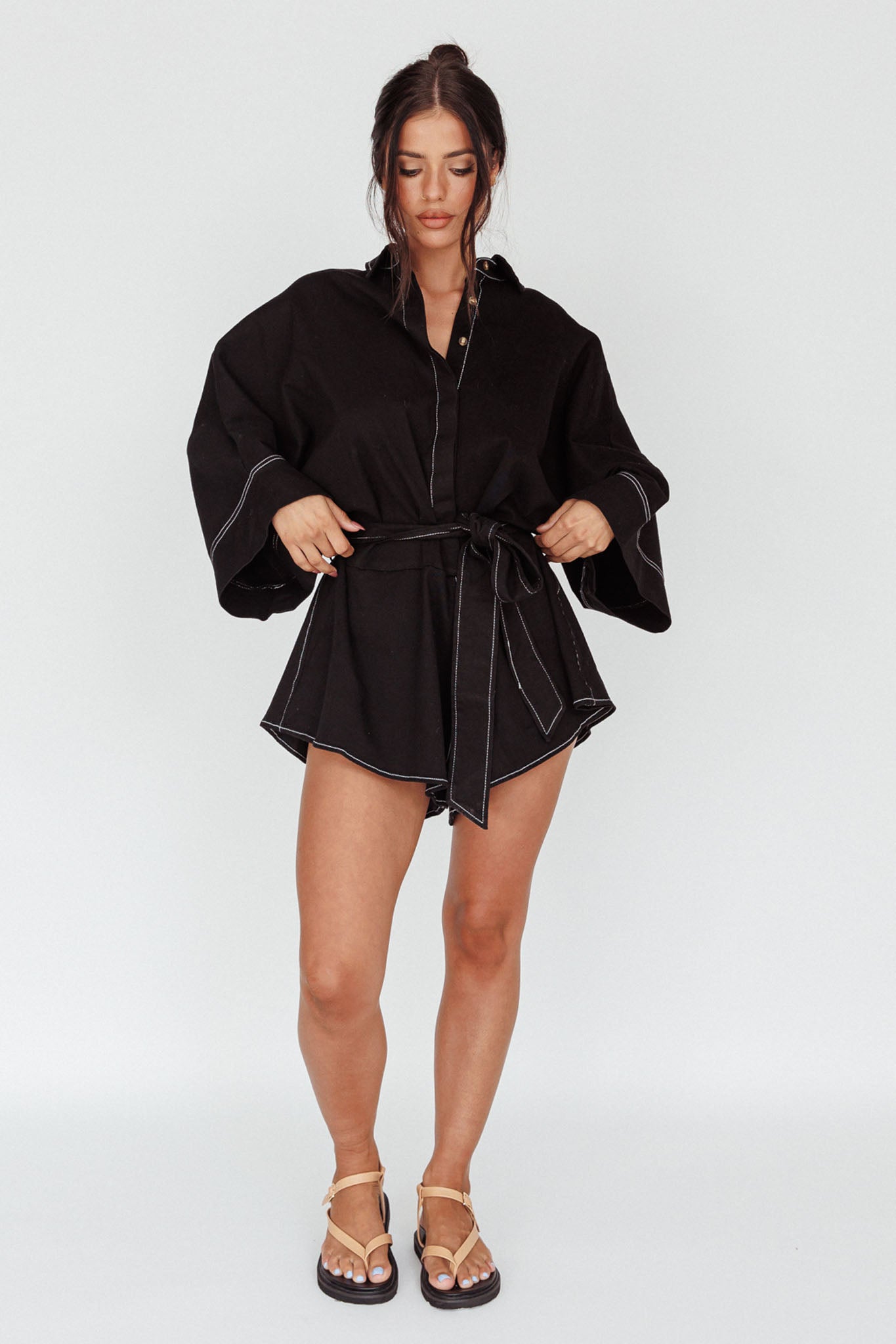 Breeze through your day in style in our chic Daytona Beach romper. Featuring a long sleeve, shirt style and removable waist tie, it's perfect for weekend coffee dates with your girls teamed with a straw tote and slides.