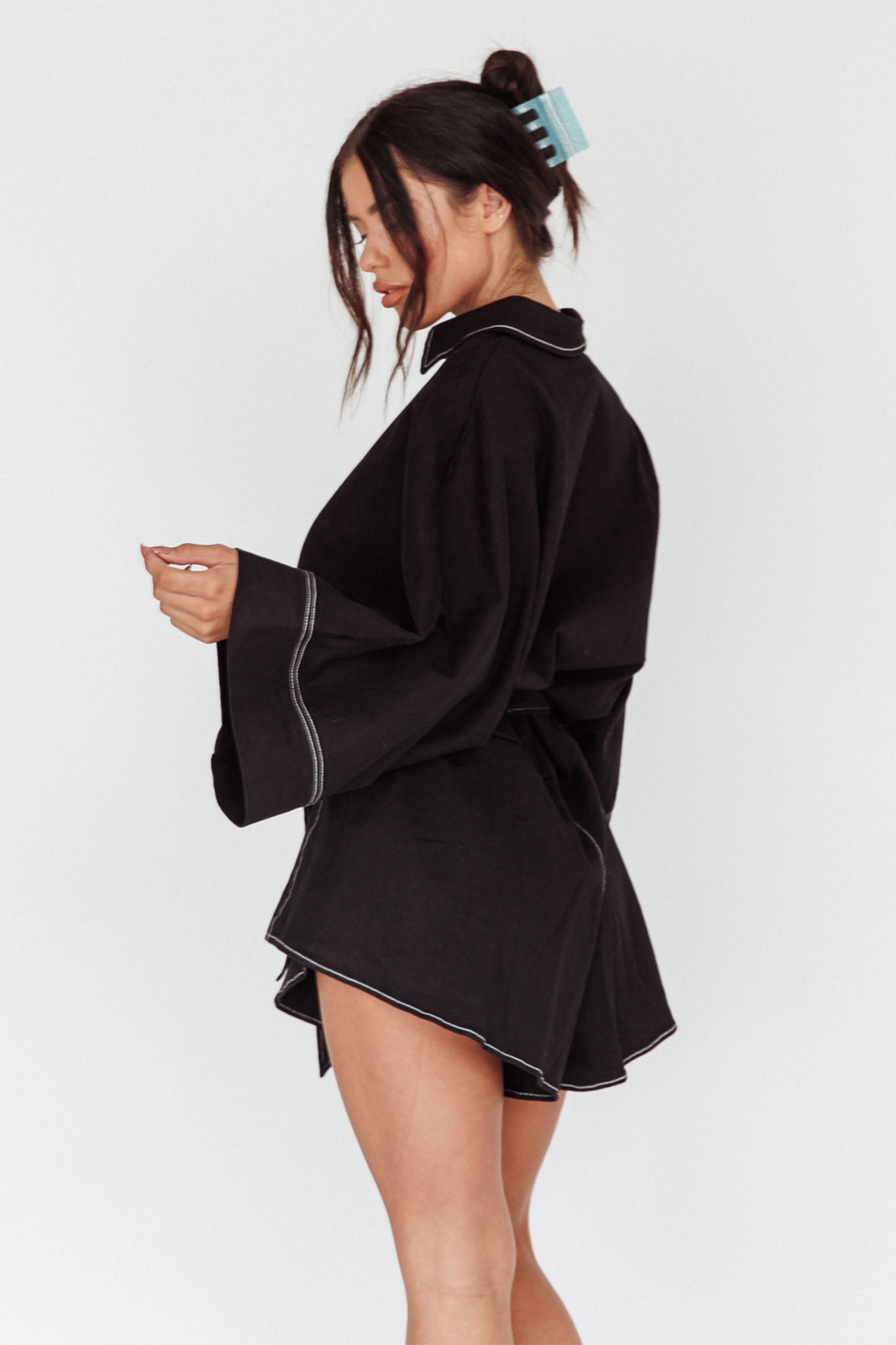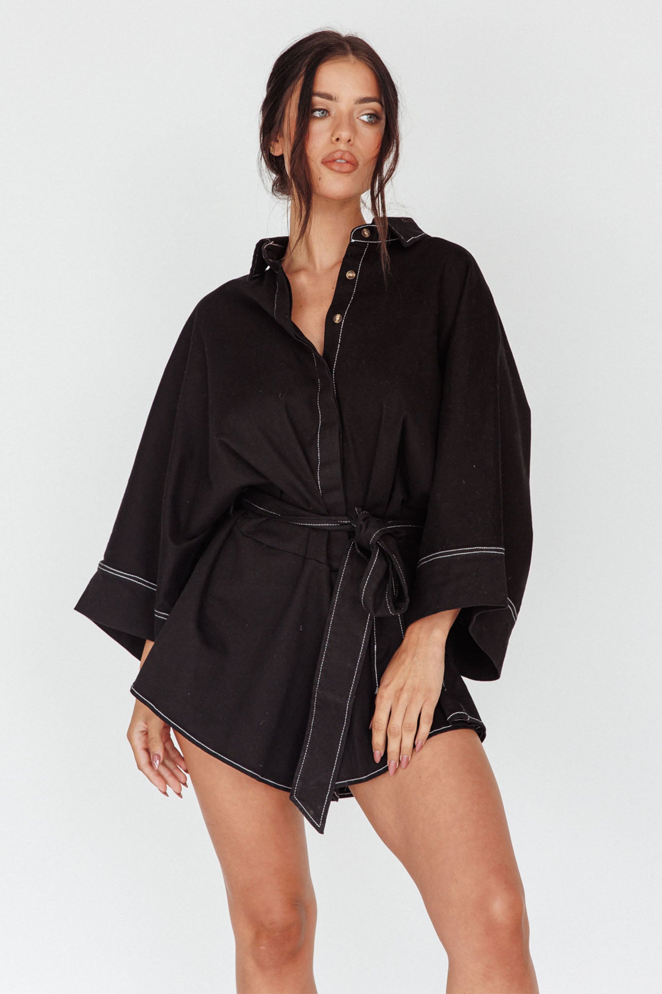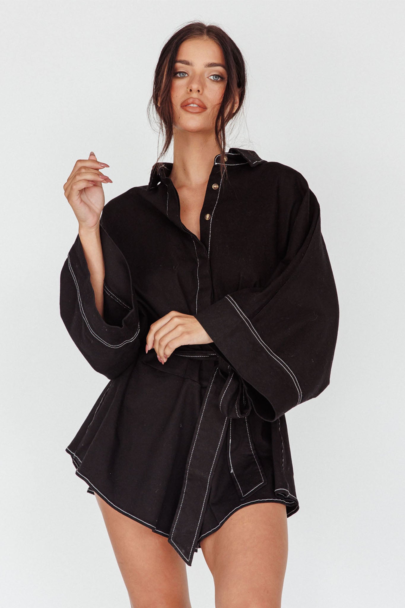 Breeze through your day in style in our chic Daytona Beach romper. Featuring a long sleeve, shirt style and removable waist tie, it's perfect for weekend coffee dates with your girls teamed with a straw tote and slides.