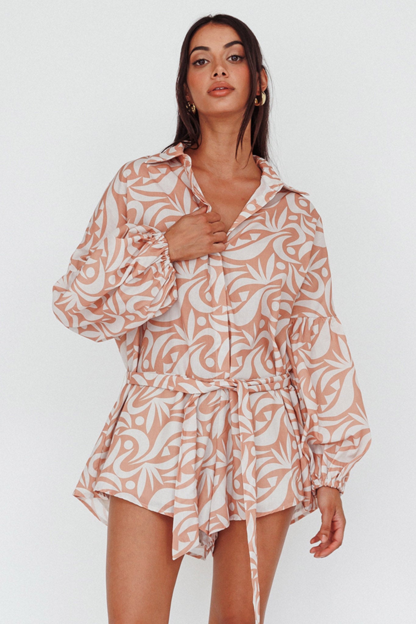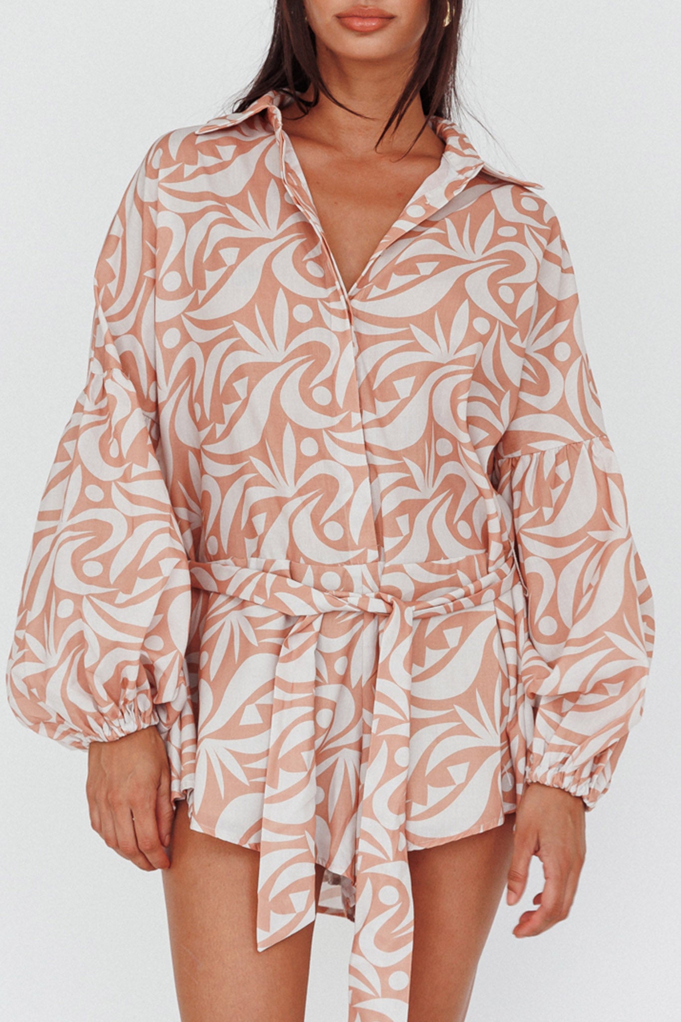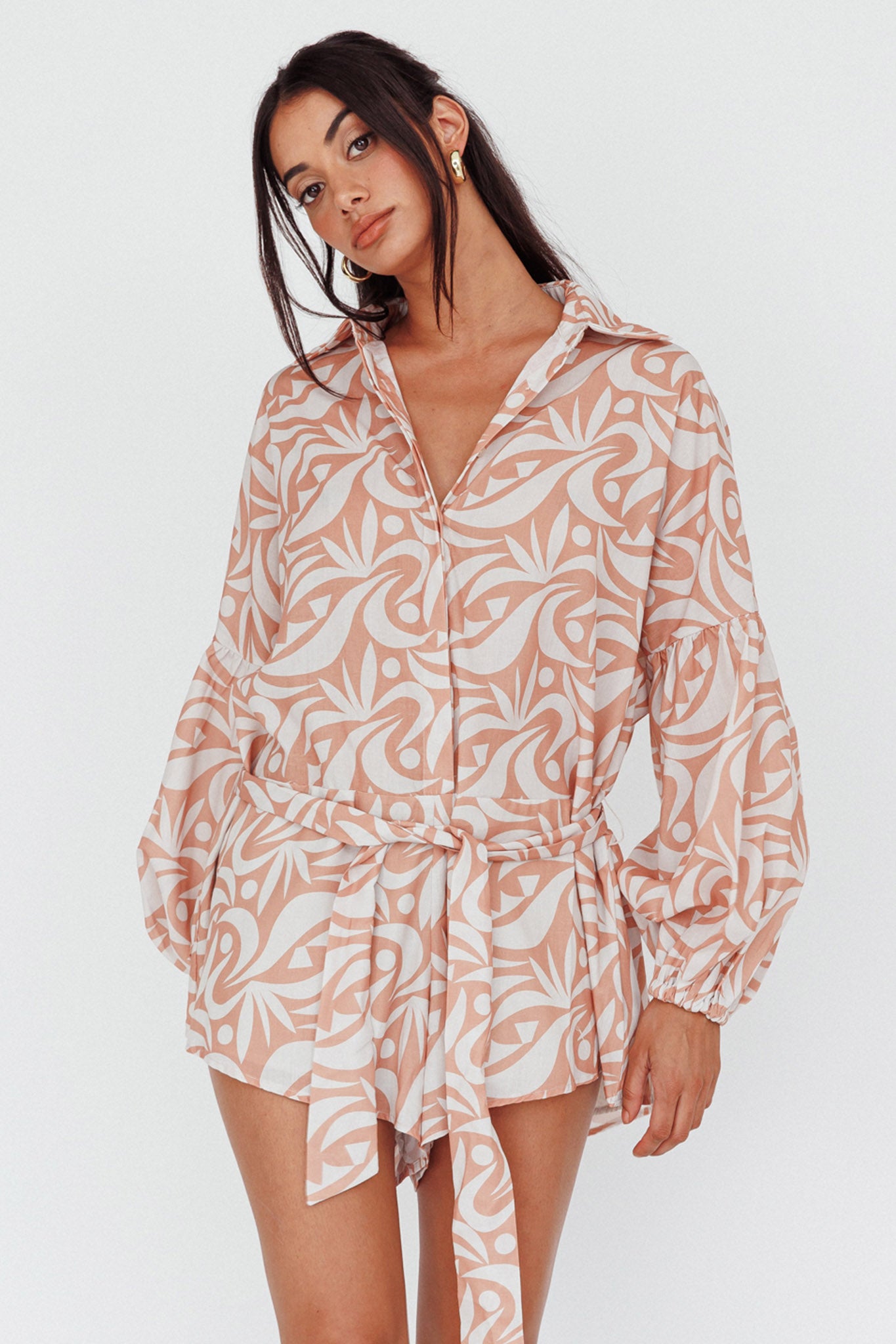 Breeze through your day in style in our chic Daytona Beach romper. Featuring a long sleeve, shirt style and removable waist tie, it's perfect for weekend coffee dates with your girls teamed with a straw tote and slides.